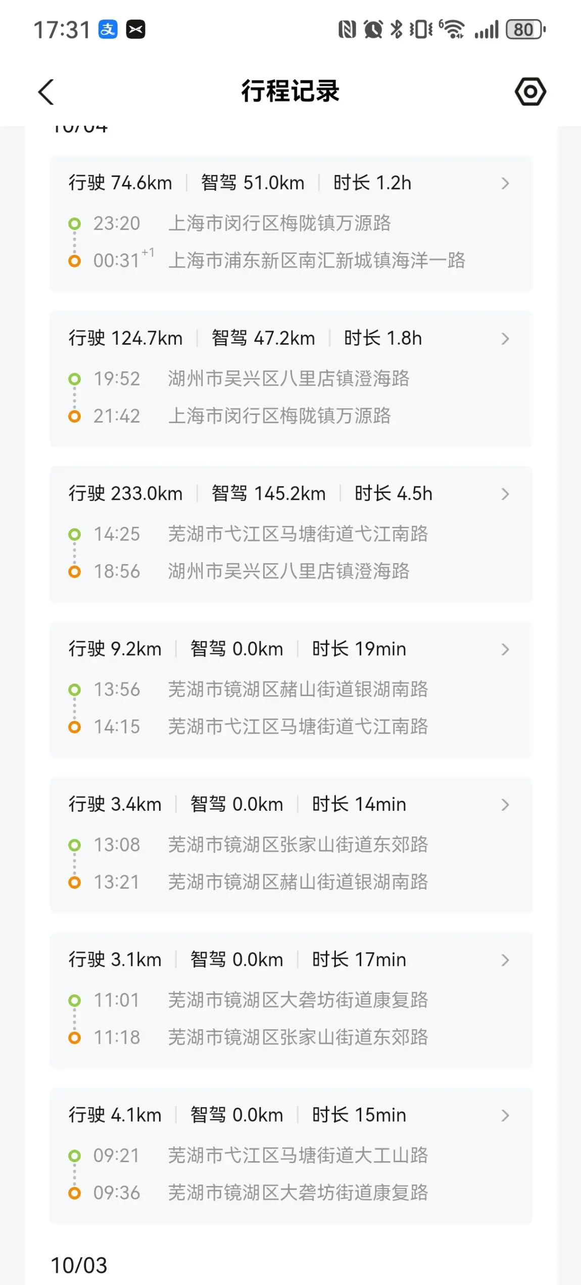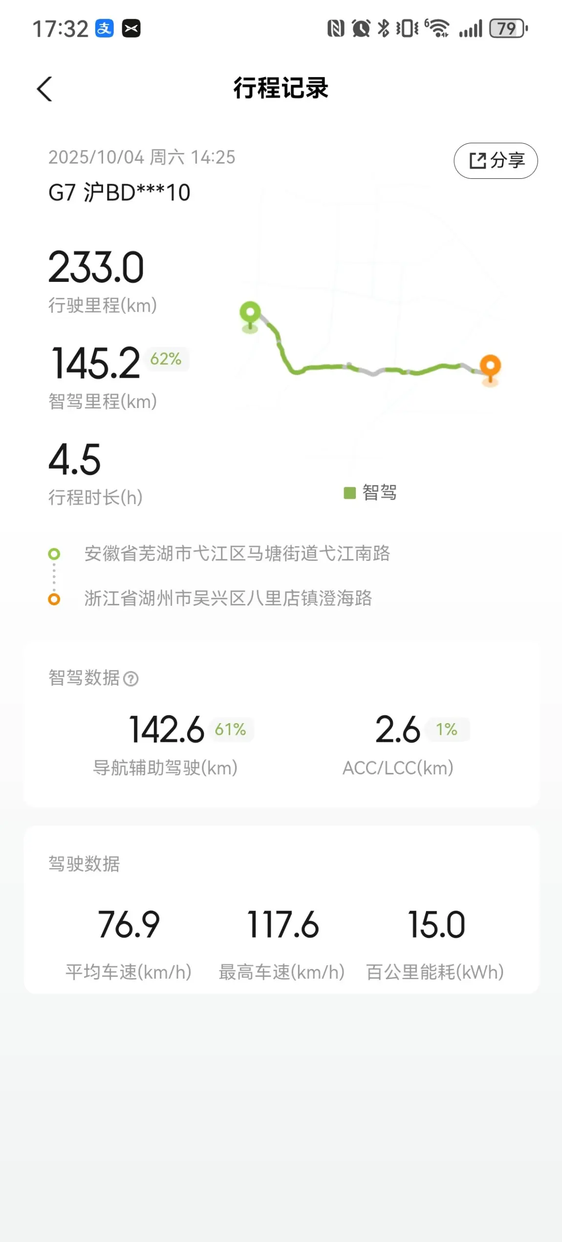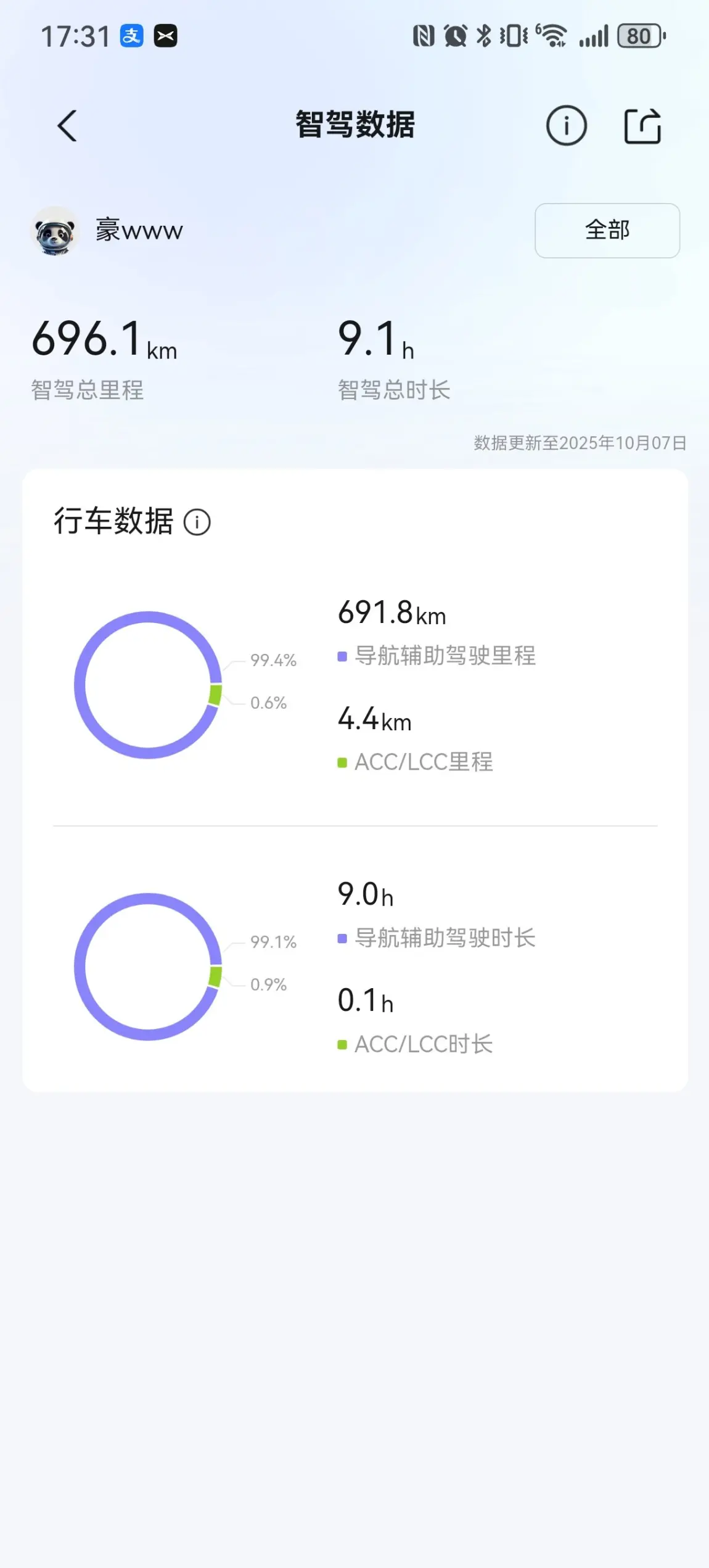 国庆几天长途出行50%均使用智驾,极大的降低了精力损耗和疲劳,全程智驾行驶十分稳定,驾驶速度超车变道匝道都符合自己的逾期,人机共驾十分好用