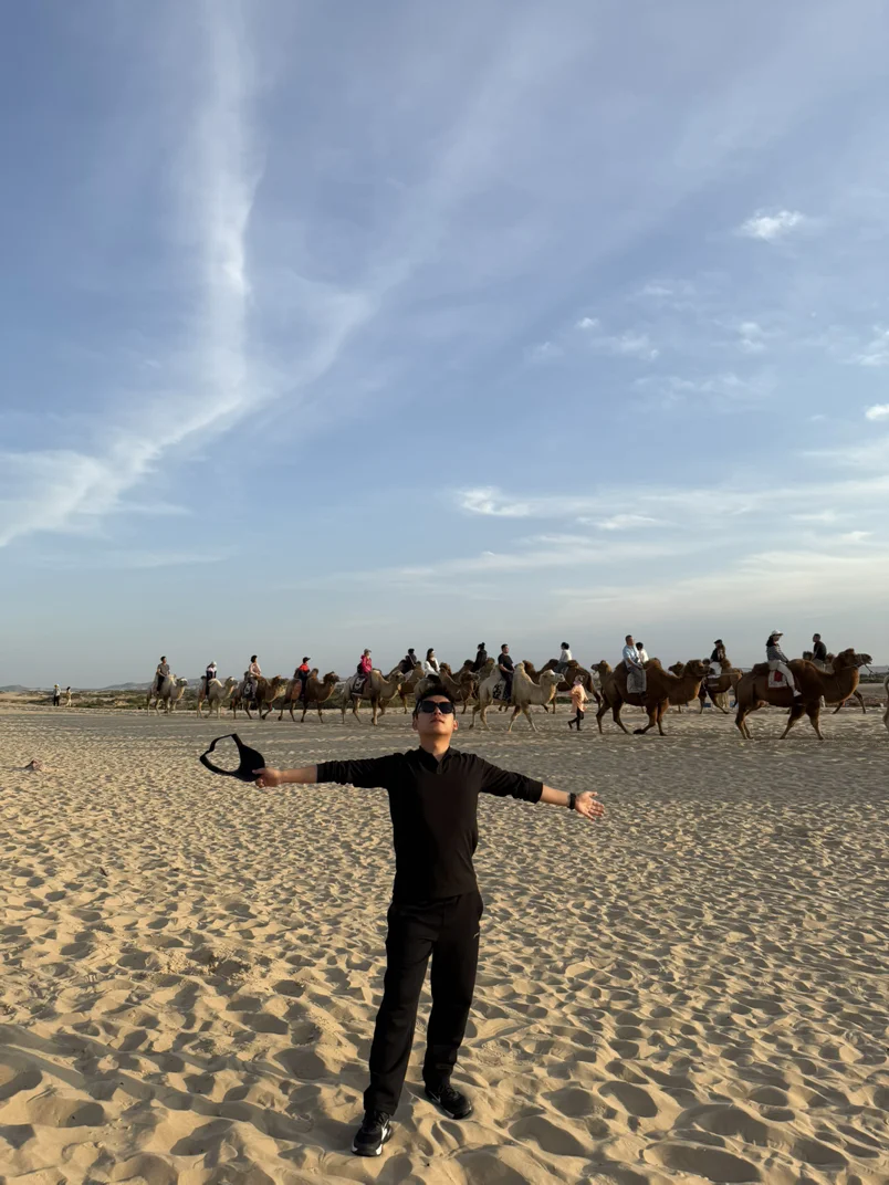 第4天:继续出发去玉龙沙湖,中午到达(没进景区),爬沙漠,飞无人机,之后路过布日敦沙漠,骑骆驼(80一个人,大概15分钟,体验不错),滑沙,五点出发前往经棚镇,到达后在这里落脚。