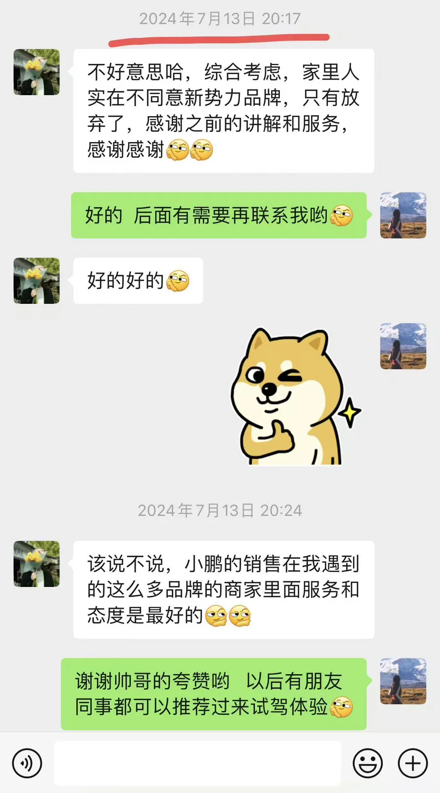 至于怎么看到的小鹏,其实挺意料之外的,商场逛到了小鹏的销售中心,就去看了看,最开始看的是小鹏G6,销售真的很热情,我也很喜欢这款车的智能化和智驾,但是颜值实在不太认同,尤其是G6的屁股设计那时候还不是特别坚定要马上换车,我的油车也就一两年,就暂时放弃了,但是!小鹏销售的服务态度不得不说,我当时还发了一段话,这也是后面我买小鹏的一个重要伏笔吧。