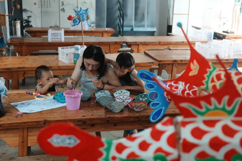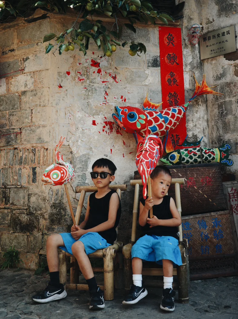 压轴宝藏必须是碧山!400年历史的石狮祠堂里藏着云贤手作体验馆,娃在这儿DIY了鱼灯、拓了版画,徽瓦彩绘玩到不想走。