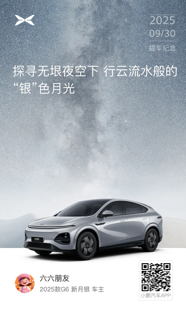 换车的想法是源于比亚迪的还是06EV看了很久,也试驾了几次,顺道看了一下小鹏G6然后开始纠结了,各种网上对比,关注优缺点,比亚迪怎么买都不出错但也是不出错,小鹏G6更科技更智能空间很大被吸引了,也担心过网上说的各种异响低频压耳等问题,但是试了都没问题当然开了这段时间也是没问题,最终选择G6后又纠结了黑色还是银色,黑色帅气但是容易脏并且这个车老婆还会开,最终选择了新月银内饰深色(事实证明是对的,外表耐脏,内饰闺女折腾也好打理)值得一提的是我是在省补结束前定的车,结束当天开的票,赶上了省补的末班车,家里都挺喜欢,欢迎新伙伴,祝愿鹏友以后越来越好,自己越来越好#小鹏汽车、#小鹏提车、#全新小鹏G6首批车主火热提车