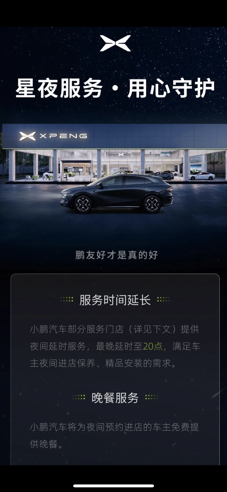对于我们上班族来说,周末的休息总是那么珍贵~时间总是想留给家人,和他们一起度过。鹏友好才是真的好!“星夜服务,用心守护”,小鹏服务时间竟然延长至晚上8点,哈哈哈,真是我们上班族的大福音啊~下了班正好去保养一番,虽然已经落日,但是小鹏的服务丝毫不逊,各种人文关怀面面俱到,爱车也是服务细致~保养完还给洗了车,又送了两个香片片,心情都美好了!周末就再也不用花时间用来保养了,感觉赚了好多时间可以陪家人陪孩子玩耍啦!