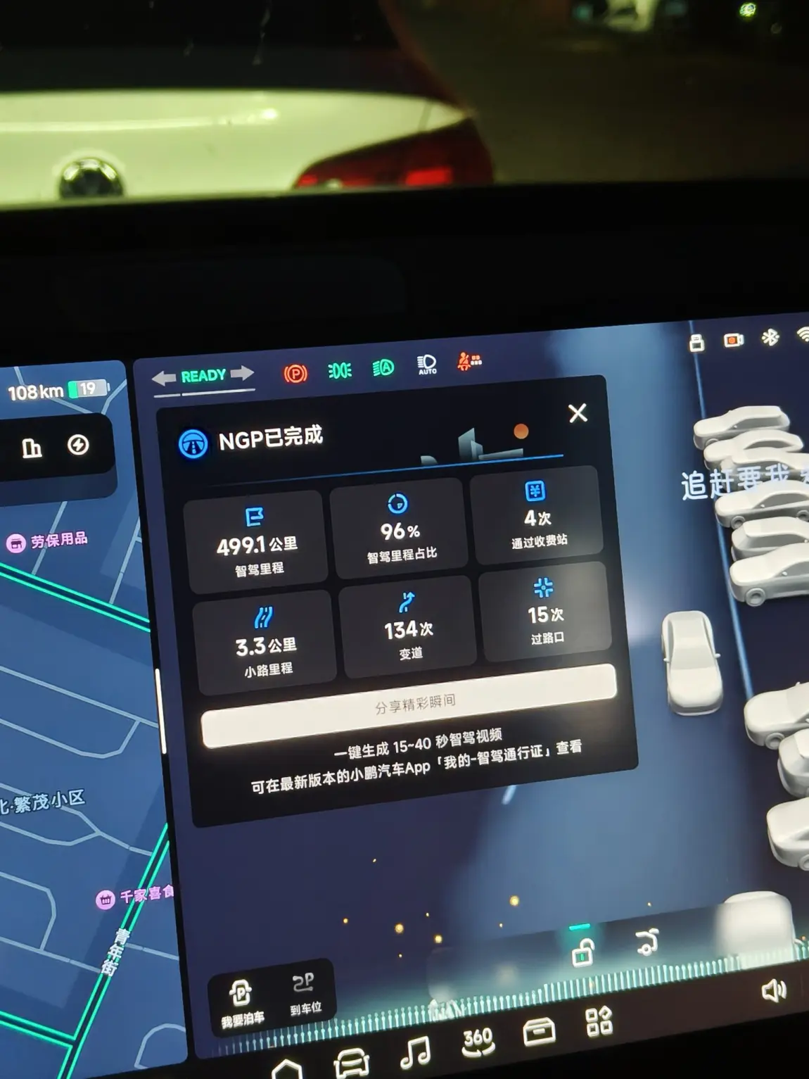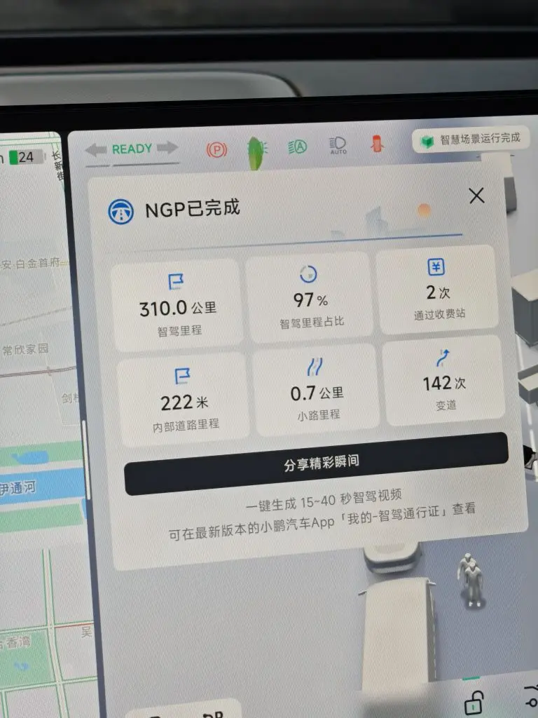 从长春出发时,我激活了小鹏的NGP功能。一路上,它展现出了强大的实力。全程智驾里程达到了4991公里(其中包含此次长春到大连的行程贡献),智驾里程占比高达96%。在高速路段,它能精准识别路况,自动变道134次,平稳通过收费站4次,甚至在一些复杂路口也能从容应对,过路口15次都表现得十分顺畅。