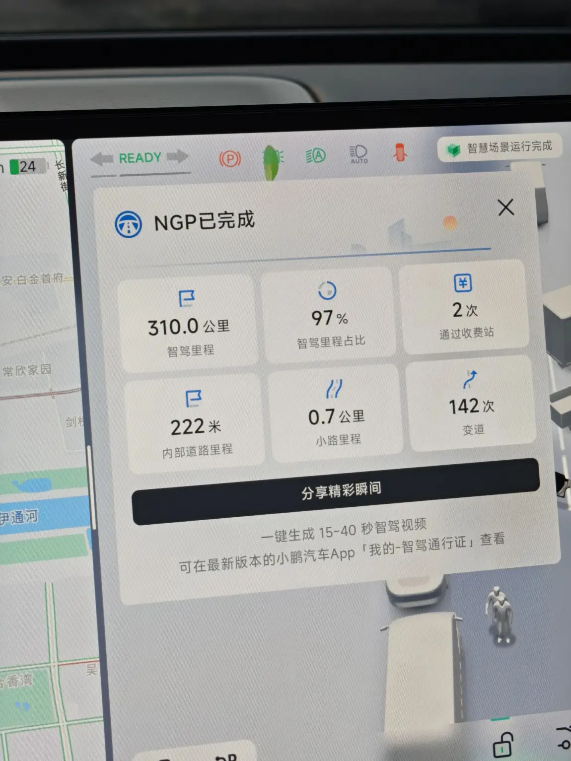 从长春出发,我便开启了小鹏NGP功能。全程智驾里程表现亮眼,其中一段行程智驾里程占比高达96%,自动变道134次,平稳通过收费站4次,过路口15次,在复杂路况下也能从容应对。另一段行程智驾里程达310.0公里,智驾里程占比97%,变道142次,通过收费站2次。