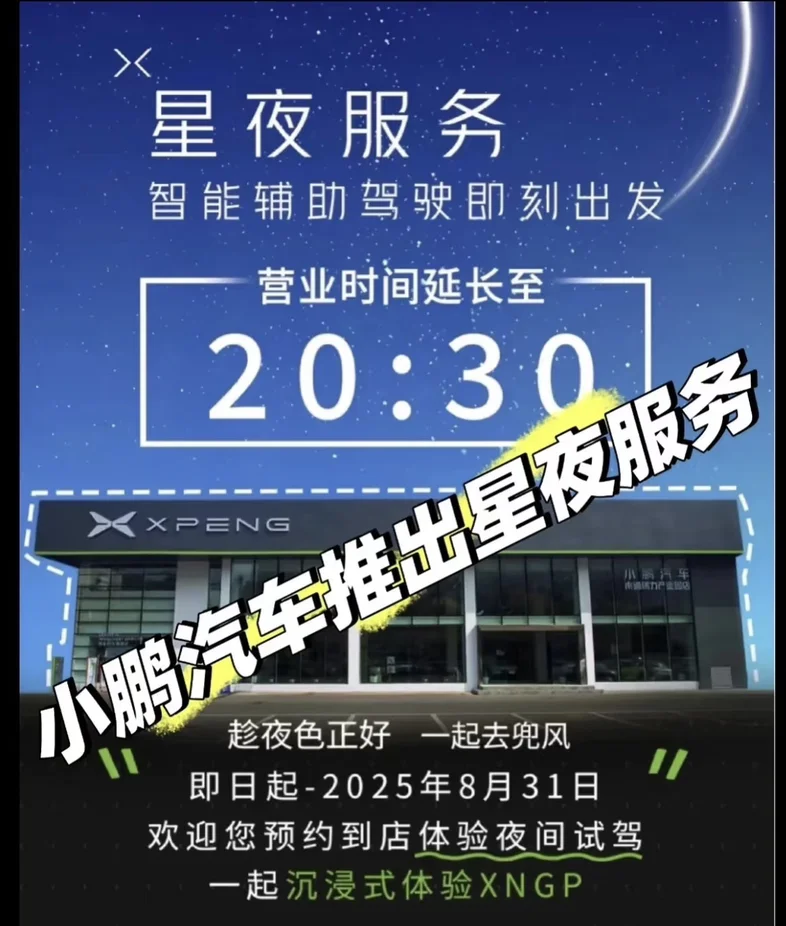 不用再为保养请假,不必让周末耗在排队里——小鹏星夜服务将售后灯光留至20:00,精准契合打工人的节奏。下班顺路到店,APP预约的绿色通道早已开启,专属管家即刻接待,无需多等一秒钟。