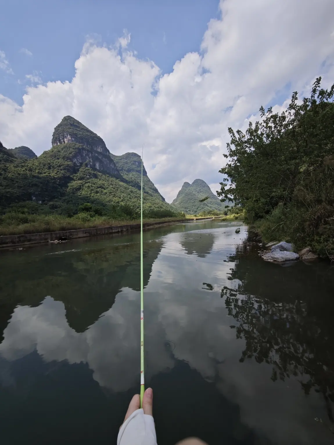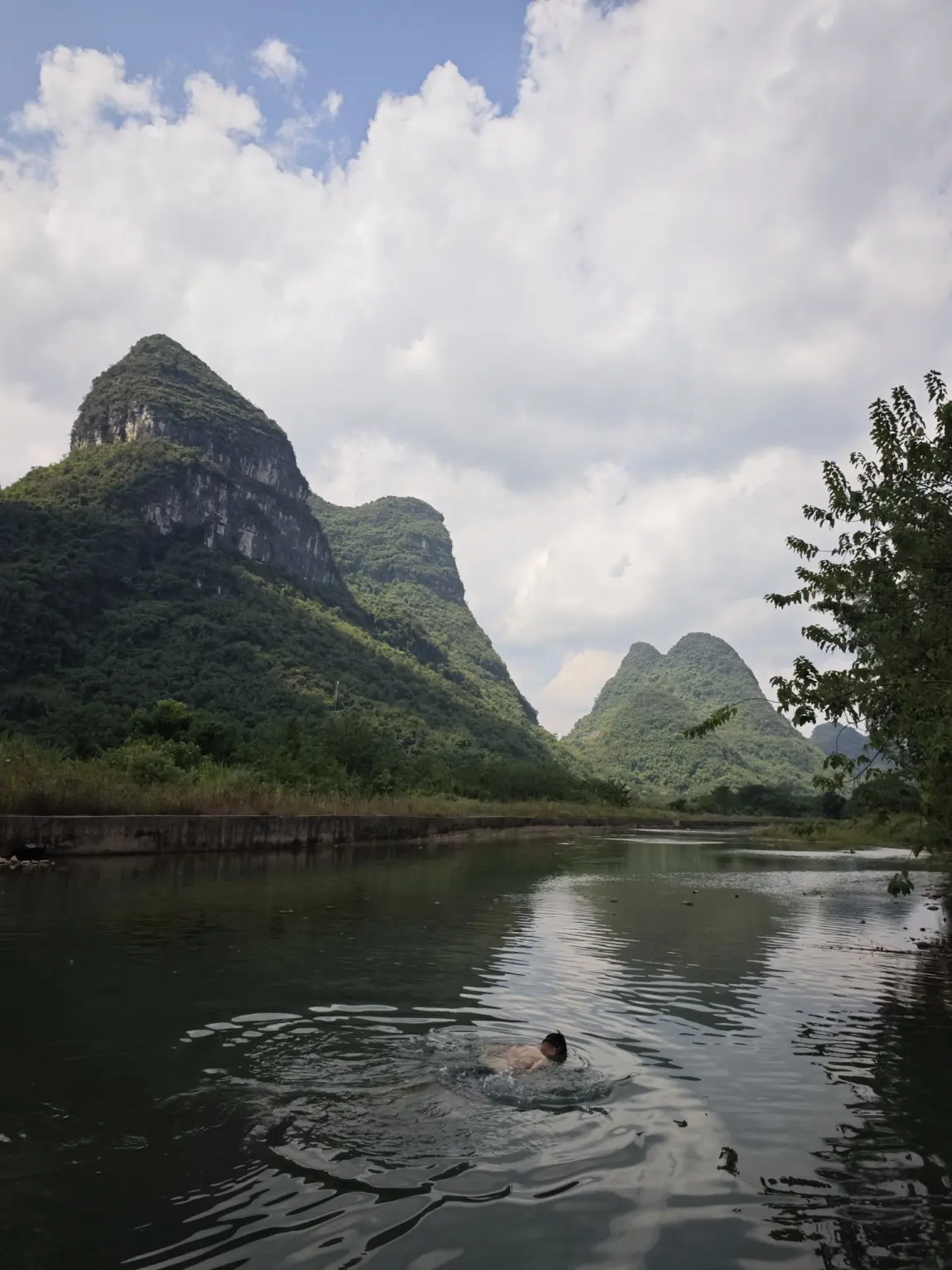 10月份的桂林气温大概在30度上下,刚好过了最热的季节,真的是太舒服了。北方旱鸭子,跟着同学到了他岳父家乡下家里,门口就有河,遇龙河的上游水质挺好,第一次下河里游泳,真的是太舒服了。