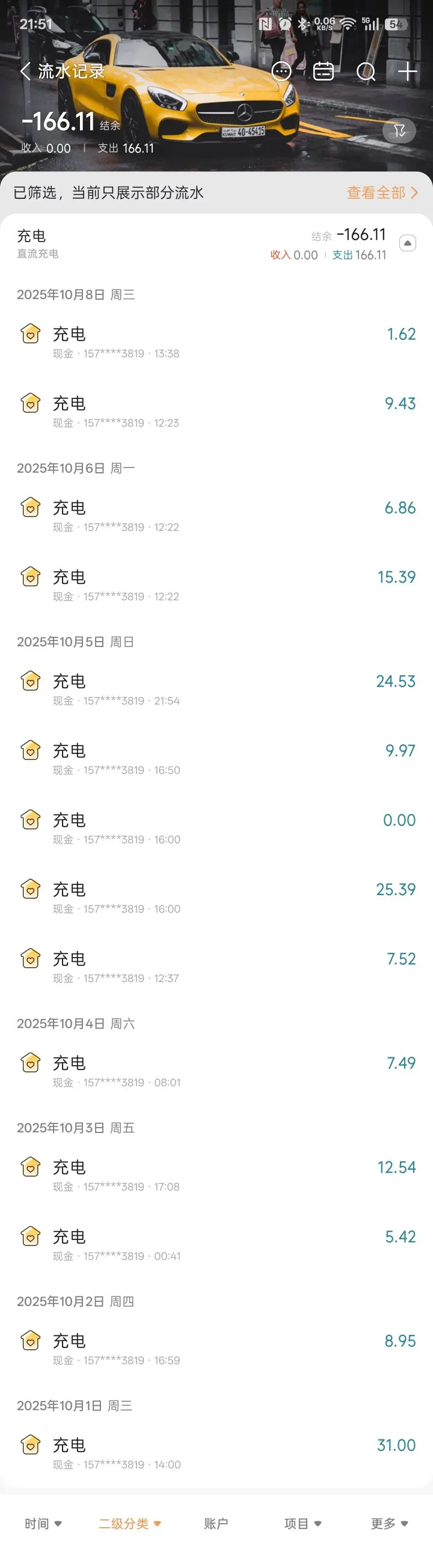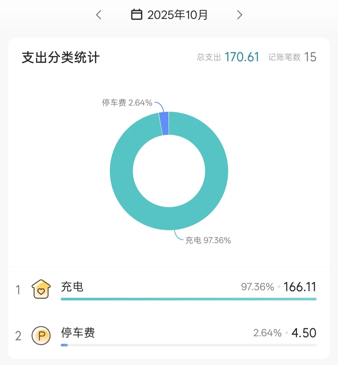 因为一直都有记录用车成本的习惯。所以,话不多说,先上图,本次共计记账15比,因为出行前把电补满,故本次成本计算也要用满电来测算!总的成本是170.61元,其中充电费用166.11元,停车费4.5元。合计用车成本为:170.61/2222=0.077元/km!