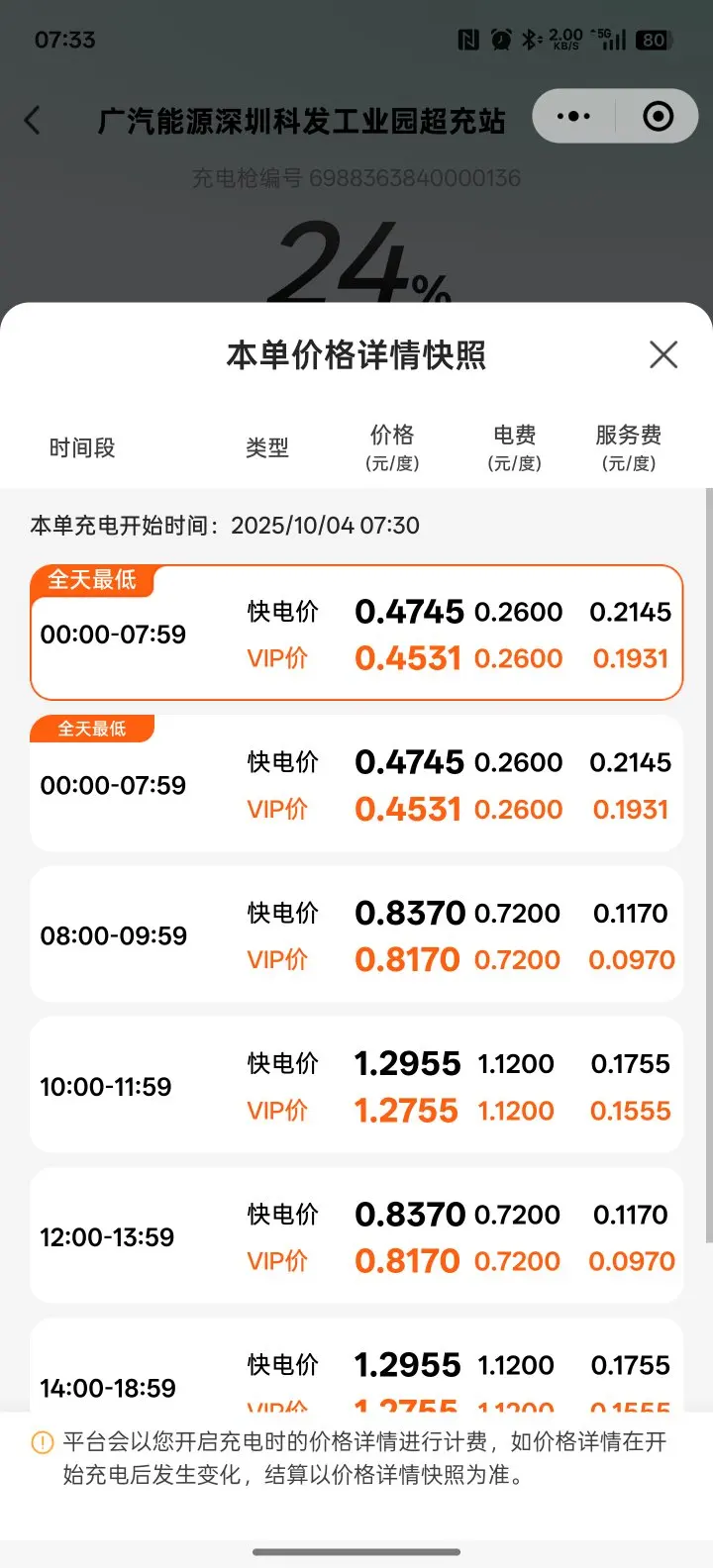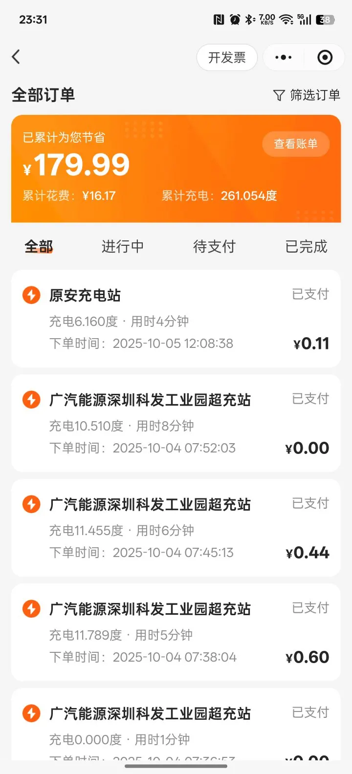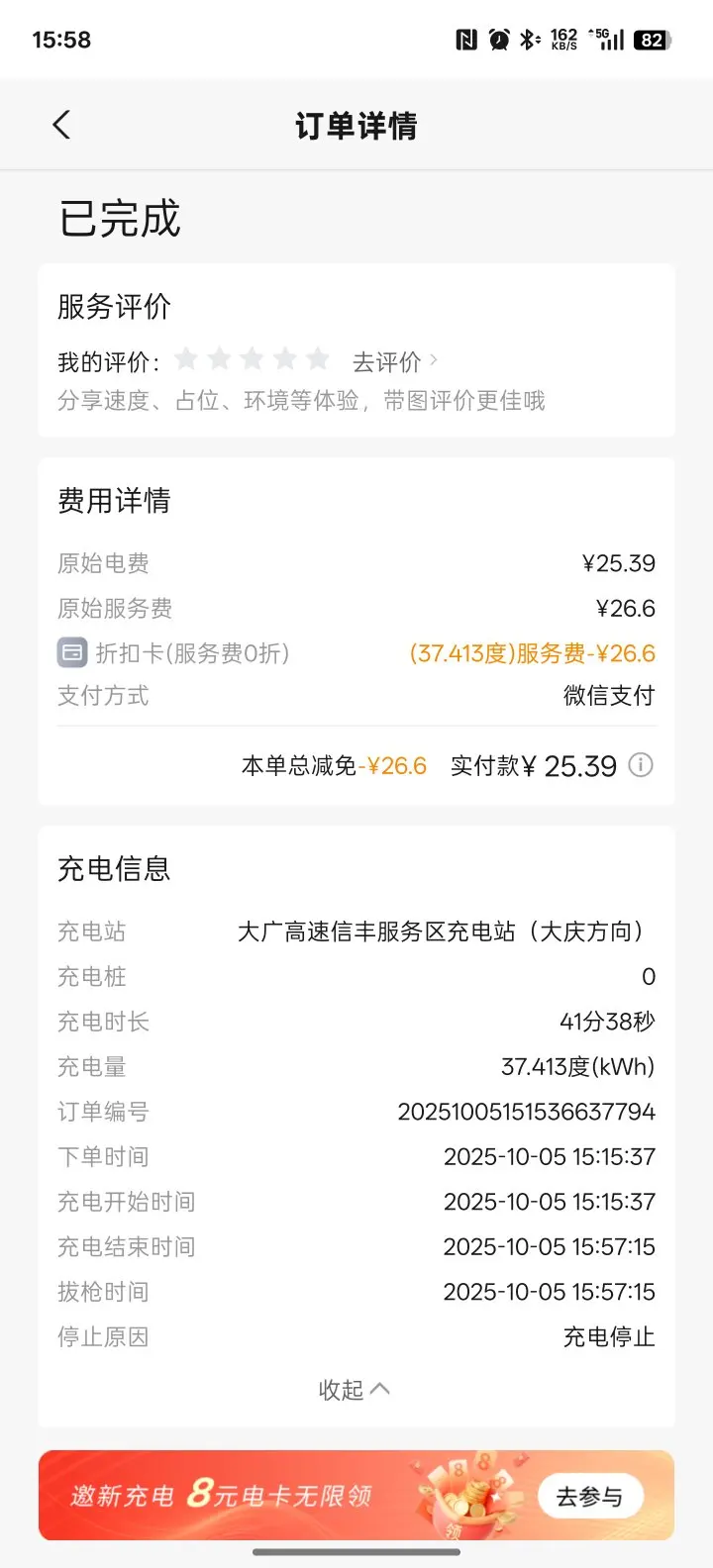比如,从惠州返程途中,我就在信丰服务区和南康服务区把6服务费减免券用上了!而且去除服务费来讲,高速充电费用其实也可以接受。37.41度电,抵扣优惠之后仅我阿胶25.39元,折合单价25.39/37.41≈0.68元。这个价格只想说,我出发前的电不补多了!