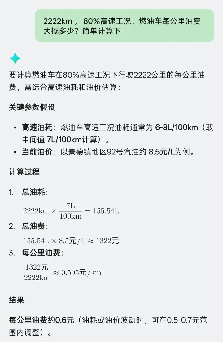 2222km里程按,燃油车80%高速工况下,单公里成本约为0.595元。