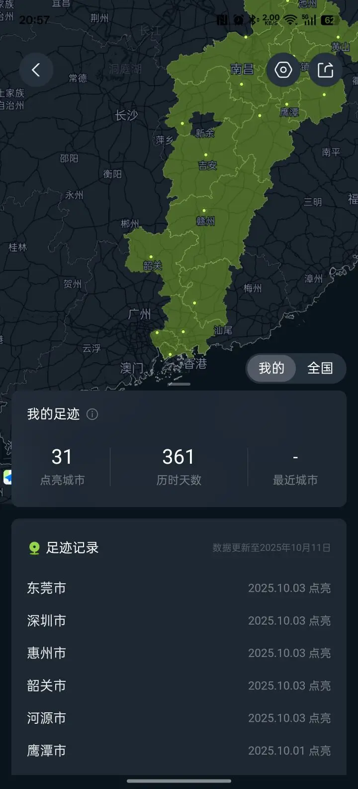 绿色出行一定要智驾相伴!最后,不得不说说本次的智驾出行体验,因为是第一次开G6南下,所到之处也都全部点亮了智驾地图。一次旅行点亮鹰潭河源、韶关、东莞、深圳、惠州六城!