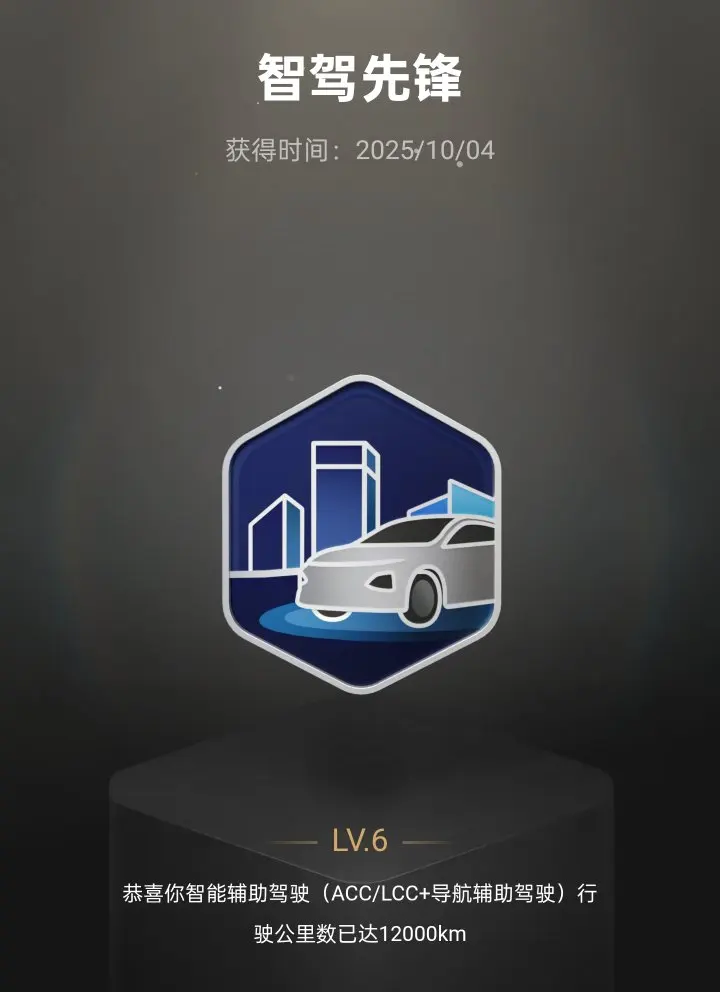 特别是在10月4日这天,我的智驾里程顺利突破12000km,勋章来到LV6级别。对我来说这又是一次突破!