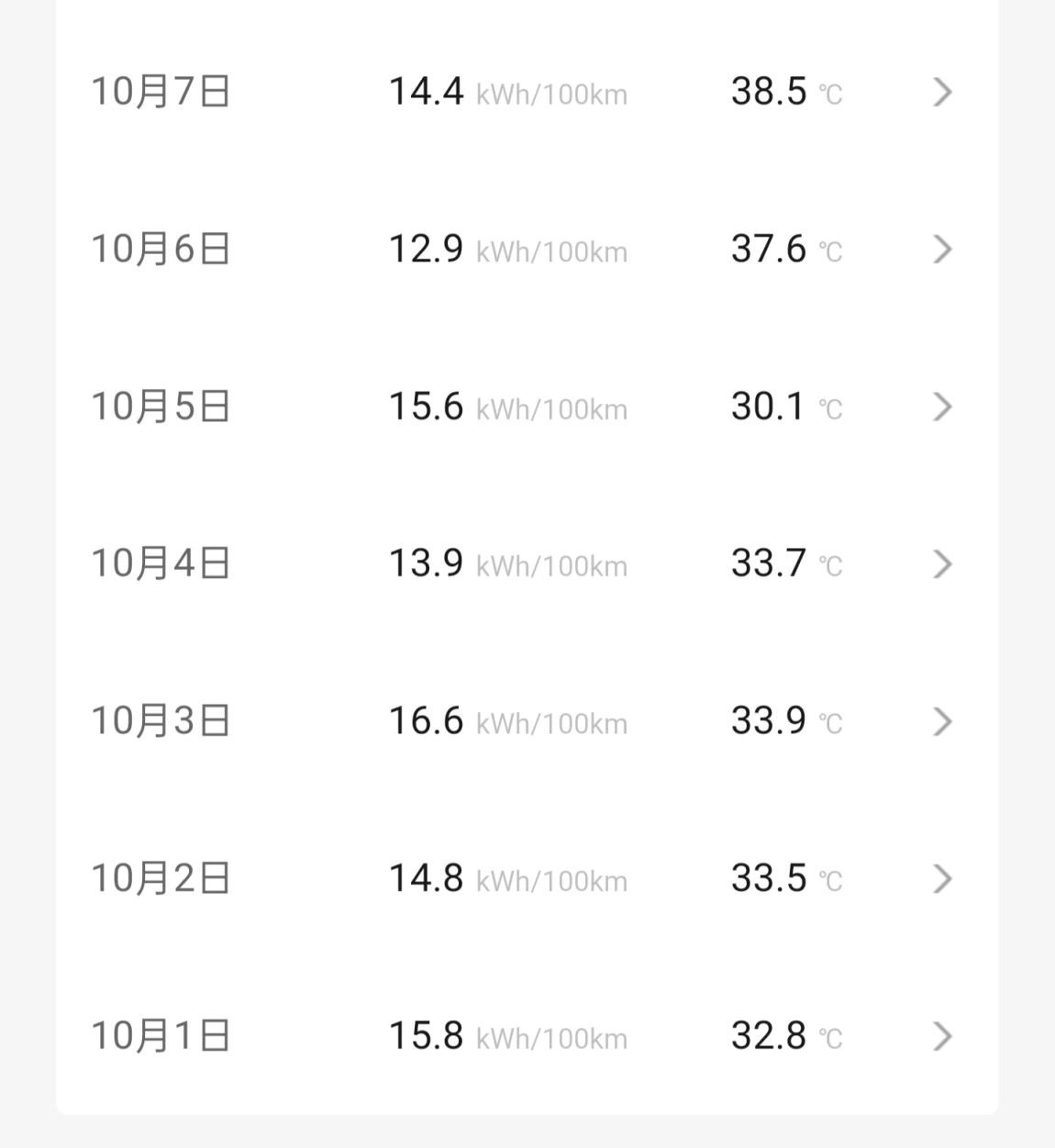 能耗最低的是10月6日,全程市区行驶,虽然温度很高,但依然保持13kwh/100km以内的超级好能耗。