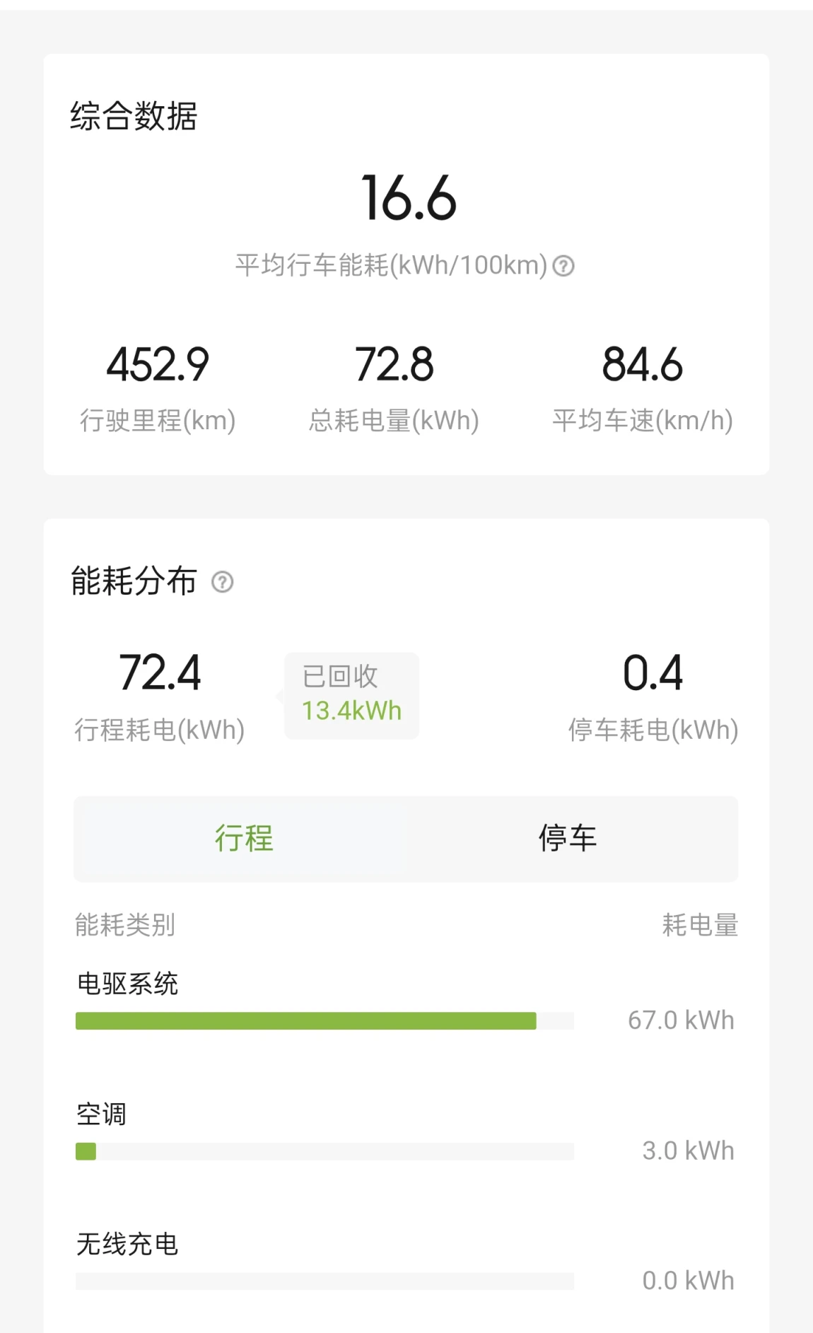 根据后台显示,可以看到最高能耗为10月3日,当天能耗WWI16.6kwh/100km,因为全程95%高速行驶,外加全程零拥堵。