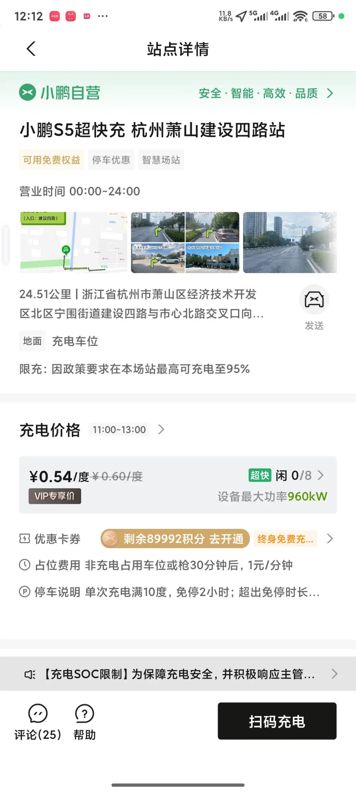 #满电黄金周,山河任我游# 国庆期间打卡杭州萧山建设四路的小鹏S5超充站,体验超棒!这里的S5超快充桩最大功率达960kW,充电速度飞快,让你告别长时间等待。站点位置很好找,位于浙江省杭州市萧山区经济技术开发区北区宁围街道建设四路与市心北路交叉口附近,跟着导航轻松抵达。充电环境也很 nice,地面充电车位宽敞整洁,周边视野开阔,蓝天白云下,充电时还能享受惬意的城市风光,是国庆出行补能的优质之选。@鹏友俱乐部 @充电小助手