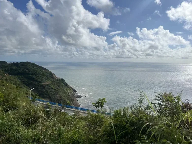 驶往苍南168海岸线的路上,天幕像是将整片天空“拉”进了车厢。起初是路边国庆挂的红灯笼掠过,没多久,一抹渐变的蓝从路尽头铺来,海浪的声音也渐渐清晰。孩子们立刻凑到天幕下,小手指着远方的白帆喊:“妈妈!海是蓝的,云好像飘在海上!”