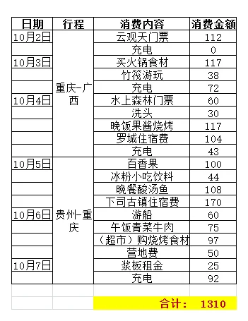国庆自驾游回来好几天了,今天抽空算了一下费用。结果不算不知道,一算吓一跳。我们是10月2日从重庆出发到广西河池,在小县城玩了3天,赶在台风来临之前往回走,顺路到贵州又玩了3天,最后在10月7日回到了温暖的家。行程一共六天五晚,人少、景美、消费也低,2人1车吃住行玩一共花费了1310元。