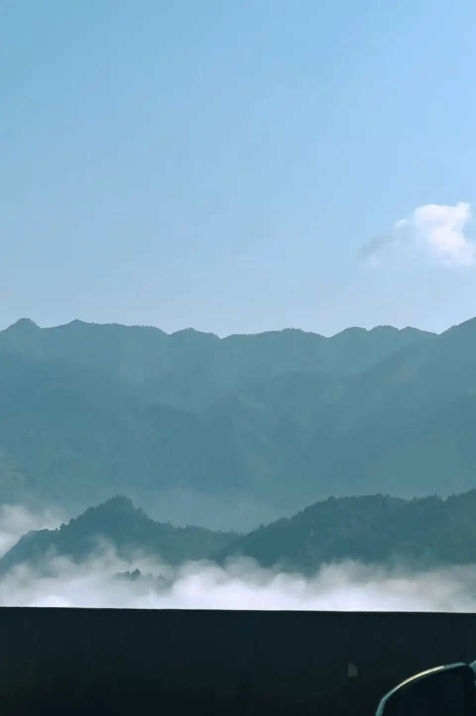 停止在隧道口处,周边都是山,清晨山间环绕着云雾,景色很美,拥堵得各车上人员纷纷下车拍照欣赏美景。