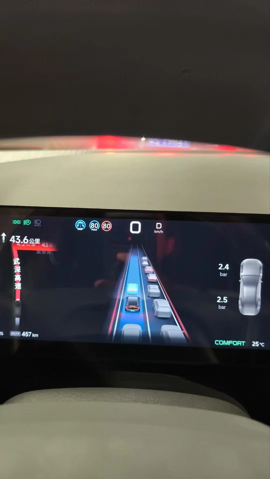 经过国道加油站的小憩整顿后,天色已暗,乡间国道更不利于行车安全,决定19:30上高速,驶入高速道路,瞬时感觉高速车流的压迫恐怖感,行车更加谨慎小心,没有路灯的高速被无数的车灯照满了整条道路,无意间发现很多车开启了小蓝灯智能辅助驾驶进行中,也偶遇很多小P鹏友,有G9/X9/P7+/G6等鹏友的陪伴,相信NGP夜晚也是可以的,毅然在合适机会上我也开启小蓝灯,多了几十个传感器和摄像头雷达辅助加持,让我在假期车流大潮中更有信心地驾驶,