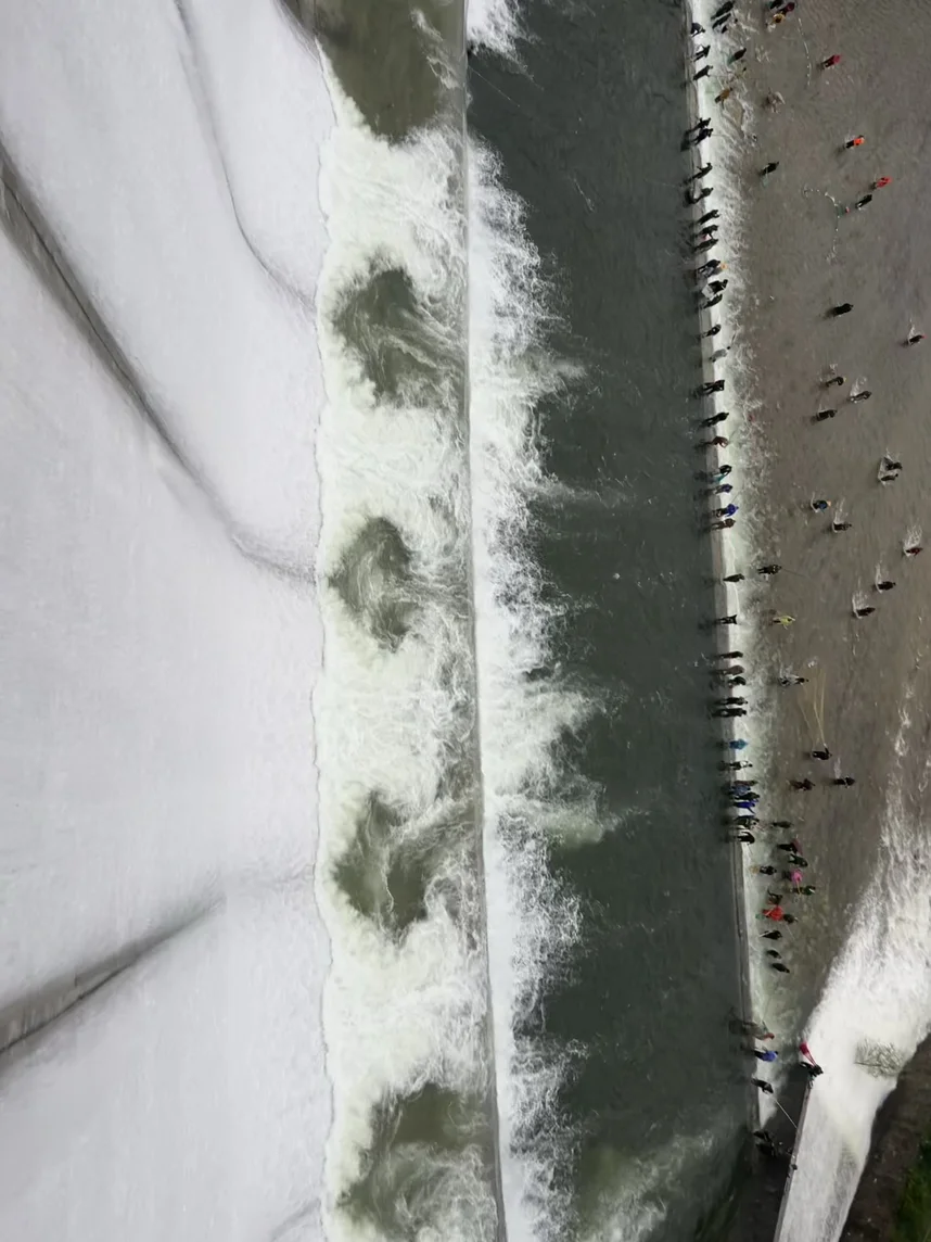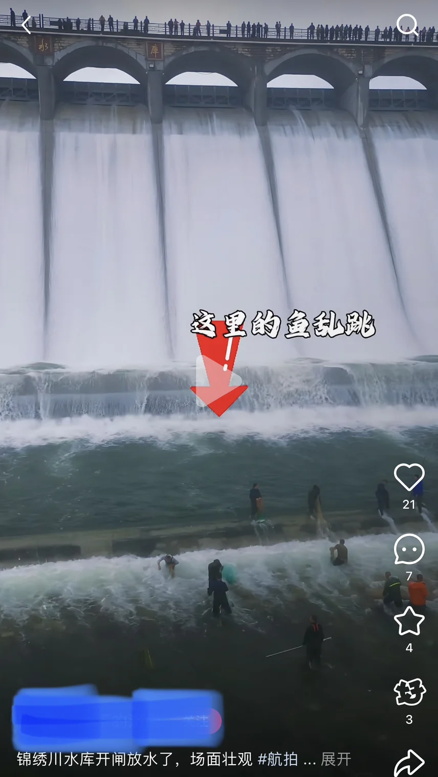 周日一早,手机刷到视频说济南南部山区锦绣川水库在开闸泄洪,好多人在大坝下面捉鱼。