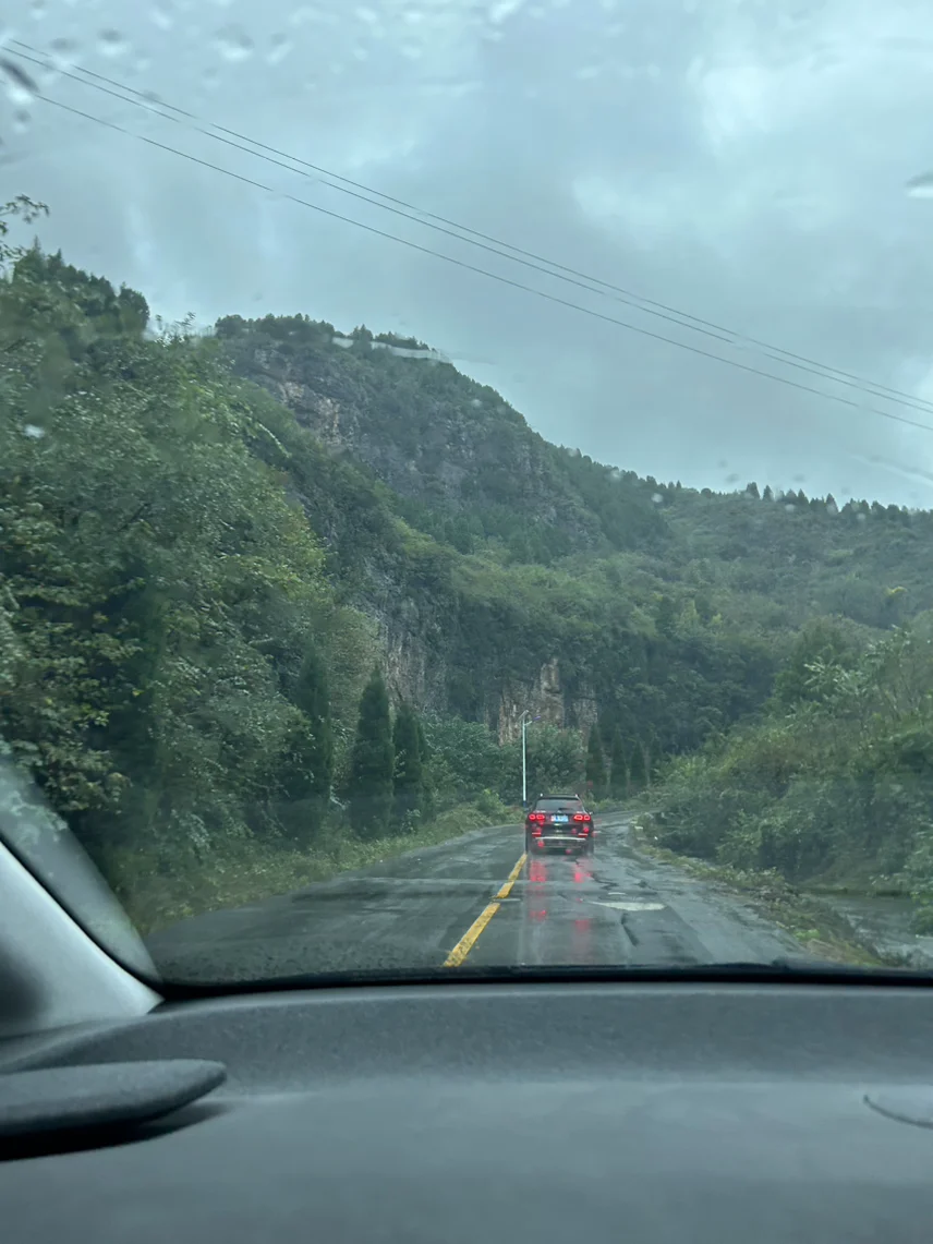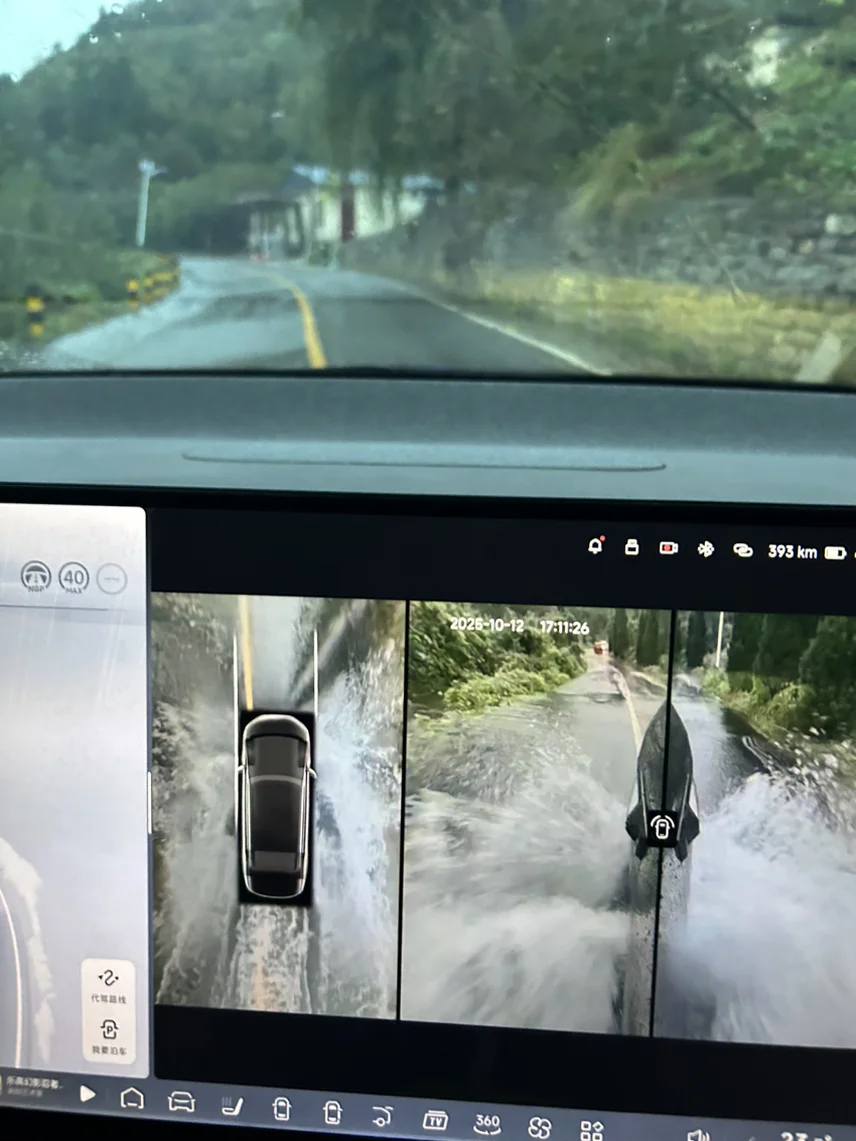 车驶出城区,进入南部山区蜿蜒的山路。下雨天视野受限,前车溅水打在风挡,完全看不清,当时慌得一批,还好我当时开启的NGP,行驶的很稳当,很安心👍🏻