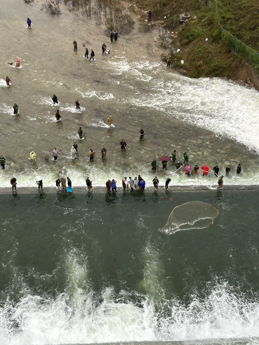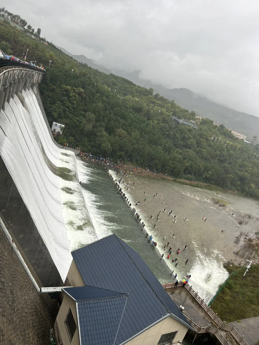 到达水库时,泄洪正如火如荼。巨瀑轰鸣而下,水雾漫天。大坝下面,几十个大人孩子拿着网兜、水桶,在及膝的水流里欢快地追逐着被冲下来的鱼。