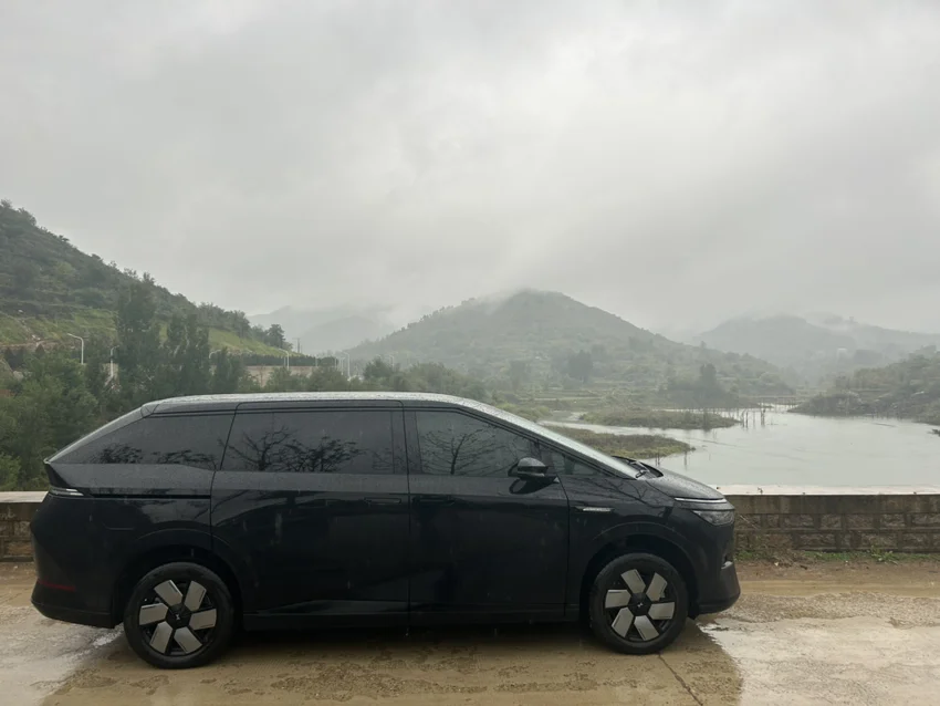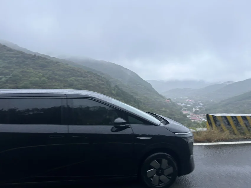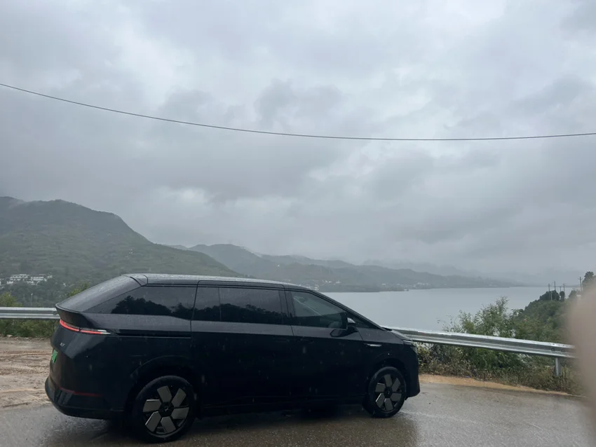 吃完午饭,我带着俩娃,开着小鹏X9,冒雨出发去南山。