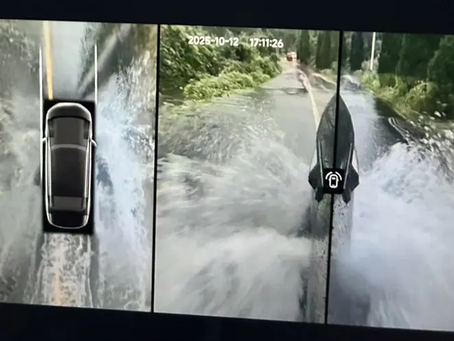 最惊心动魄的是一段低洼路段。山洪漫过路面,浑浊的水流翻滚着,几辆车犹豫着停在路边观望。我唤出小P,空气悬架自动升高,轻踩电门,X9从容向前,底盘稳稳抬升。儿子看着溅起的水花,兴奋地喊:“我们好像在开船!”
