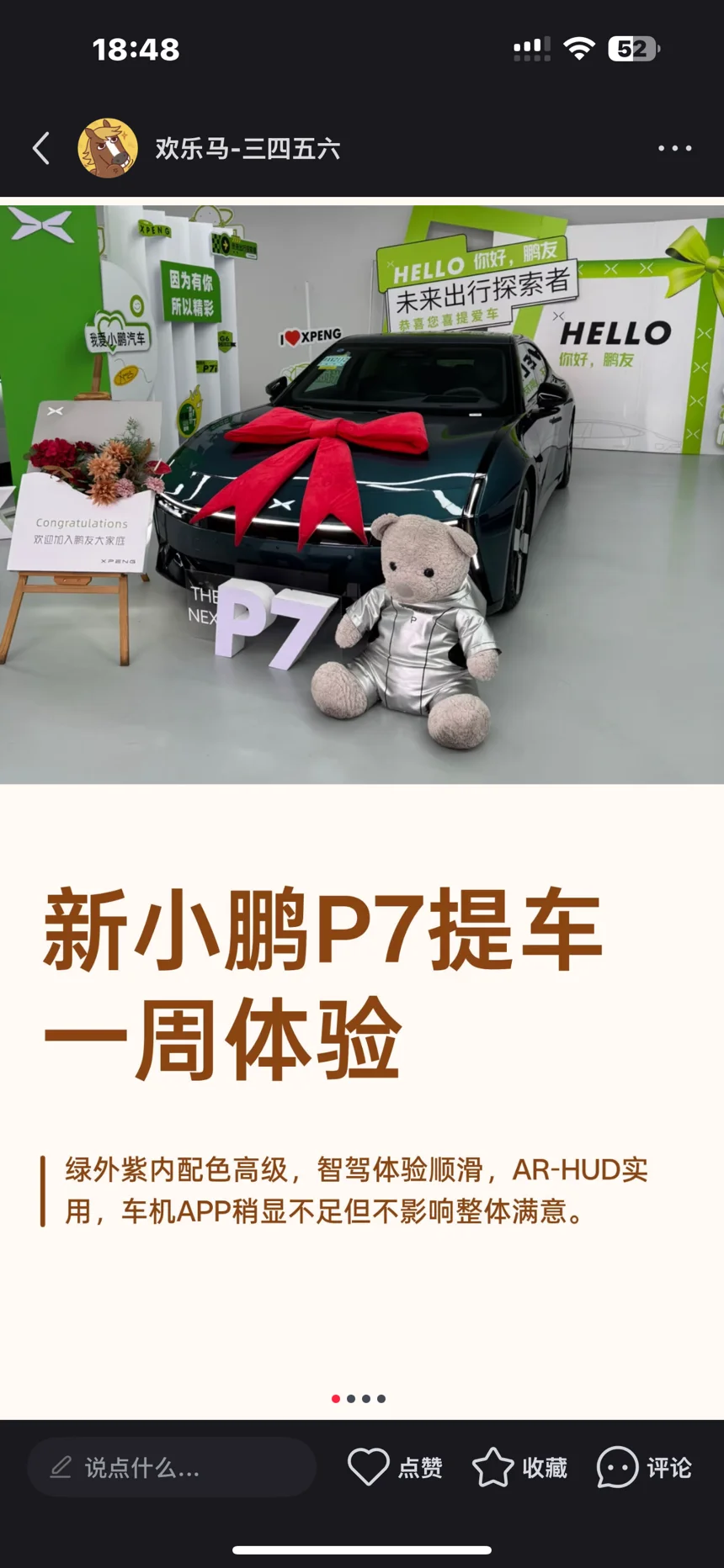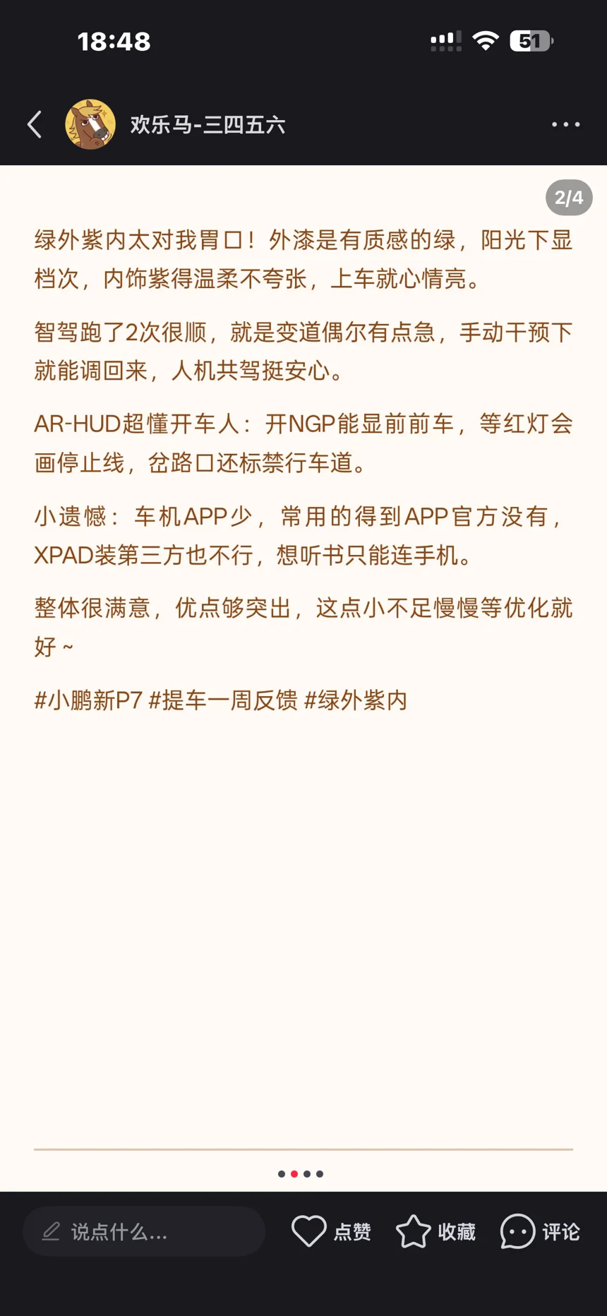 绿外紫内太对我胃口!外漆是有质感的绿,阳光下显档次,内饰紫得温柔不夸张,上车就心情亮。智驾跑了2次很顺,就是变道偶尔有点急,手动干预下就能调回来,人机共驾挺安心。AR-HUD超懂开车人:开NGP能显前前车,等红灯会画停止线,岔路口还标禁行车道。小遗憾:车机APP少,常用的得到APP官方没有,XPAD装第三方也不行,想听书只能连手机。整体很满意,优点够突出,这点小不足慢慢等优化就好~#小鹏新P7 #提车一周反馈 #绿外紫内