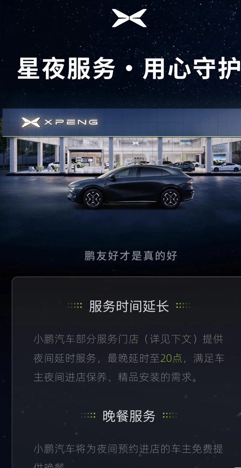 国庆节后选择了下午6点到店维保,体验了一次小鹏的夜间服务,真的很不错的态度超好,下午6点到店里还贴心的给配了晚餐,即使下班时间工作态度依然值得肯定,快速帮我检查了车辆并且给我车提供维修,对我提出的一些用车问题也用心解答。保养维修完以后还帮车做了清洗这是完全没有想到的写在最后,现在生活节奏越来越快,小鹏提供8点前的售后服务,的确不错的,比所谓的人民公仆要实在,错开上班时间,才是惠民服务,最后还送了礼品,感谢。