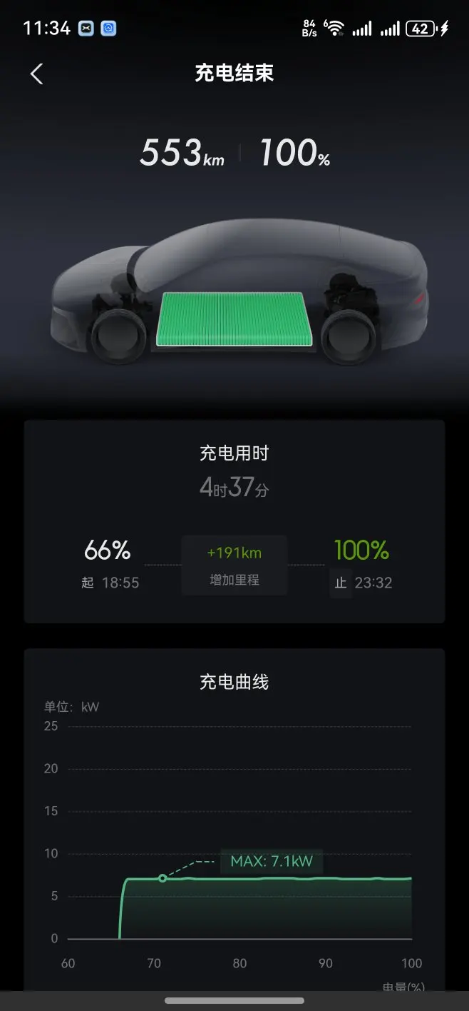 用7kw的电桩,反推一下,极低电量开个满充怎么也得10多个小时。磷酸铁锂就这个好,100%充电无压力。