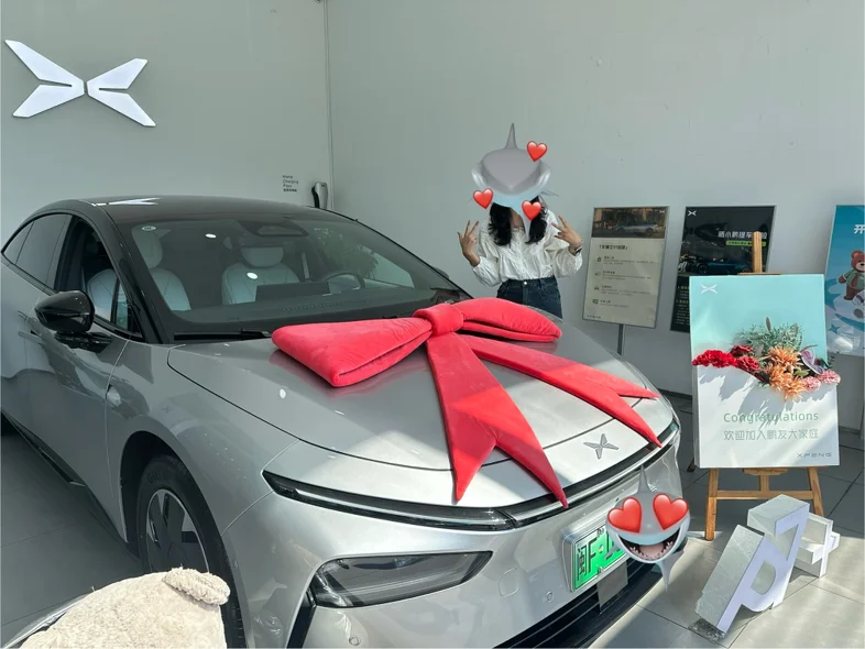 提车当天交付中心仪式感拉满,我的P7+停在C位,车漆质感绝了。工作人员耐心带我验车试功能,连后排屏幕触控都一一核对,还送了充电桩和小熊玩偶。
