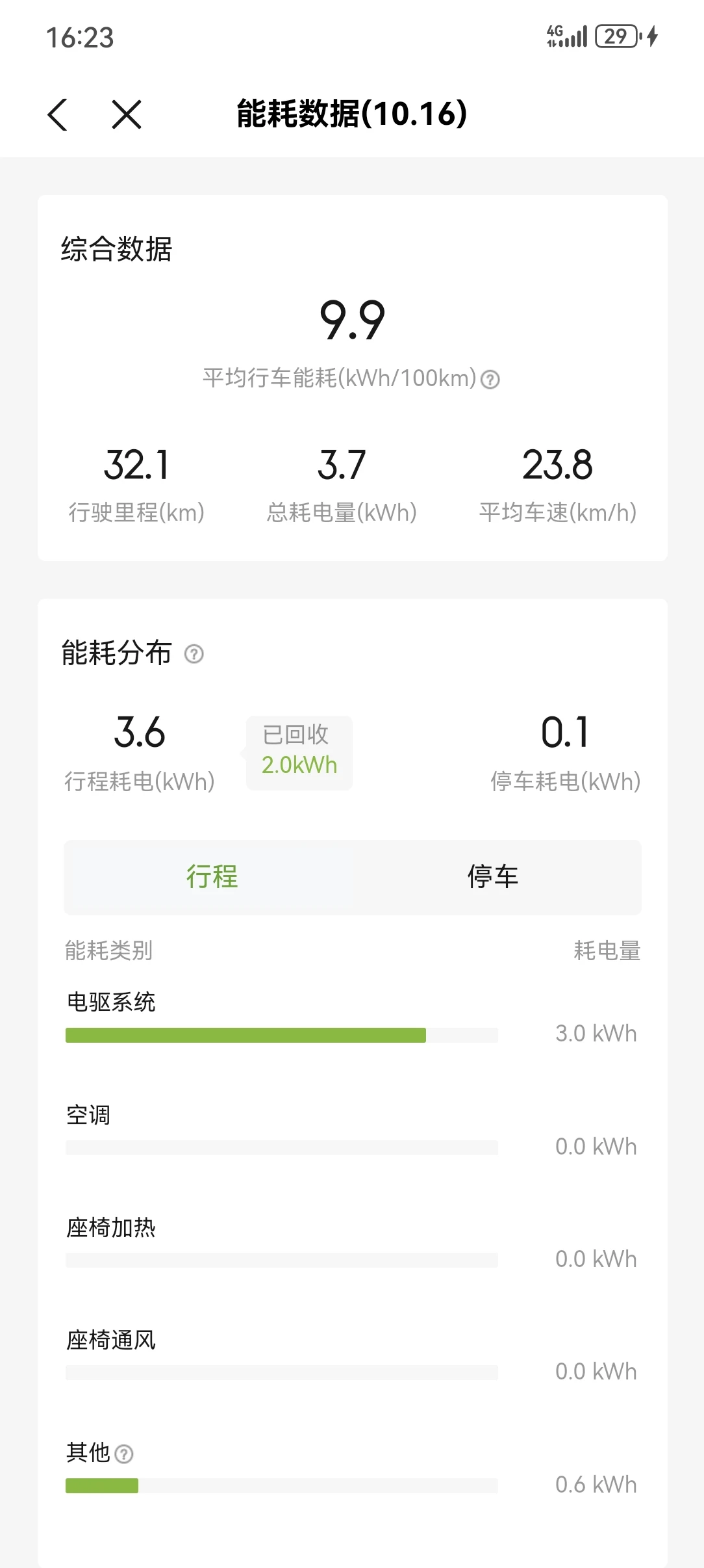 大家注意过没有,小鹏真实电耗是:行程电耗/行驶里程。例如16号那天3.6/0.321=11.2,这个数也是对的,那天掉了32公里,基本上表显里程基本上跟实际里程按cltc1:1掉里程,跟估算电耗66/5.8=11.3一致。但是上面9.9不知道怎么来的