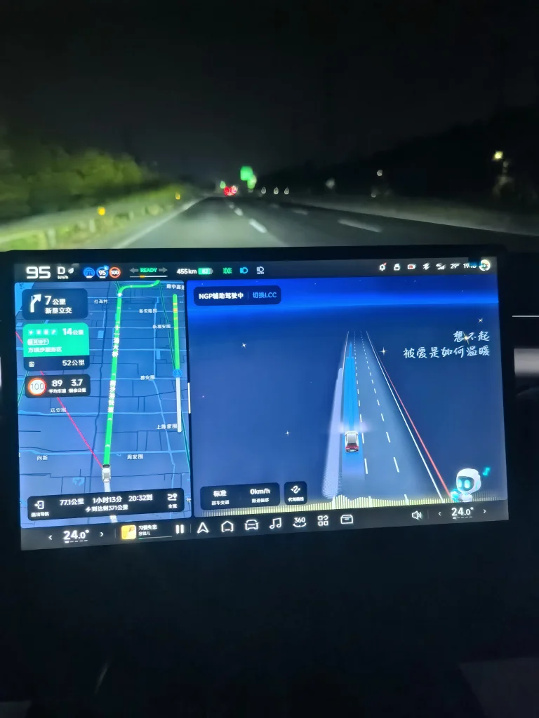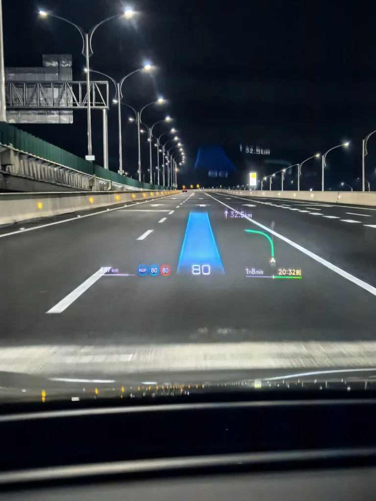 由于回程是晚上,天已经完全黑了,在佛山到深中通道之前一些路段是完全路上没有路灯的,路上经常会有一些路坡度比较大,路上也会有凹凸不平,但在NGP行驶过程中发现,整个车行驶起来都比较平稳,得益于太极底盘。系统也一直是在高速限速上下行驶,直线前方车距比较远或者没车的时候,会果断进行变道,方向一打,一气呵成,临近切换道路路口时,基本上也在提前2公里时变道至最右侧车道,这真的很棒!真的也很符合我个人的驾驶风格。