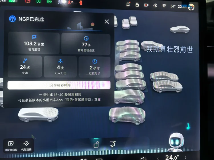 最后2个小时到达,全程高速路程有77%左右,103公里智驾。整趟行程下来NGP使用的非常方便,省心。小鹏厉害!👏