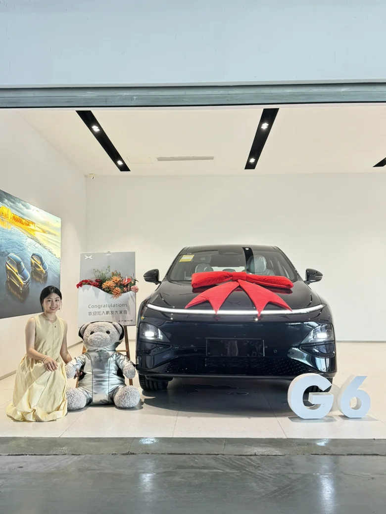 前一天收到销售通知可以前去提车,内心是满满的期待,第二天我们就前去门店提车了,进门第一眼就看到我们的小鹏G6了,黑武士黑的太亮了,完全吸引了我的注意力,大气运动的车型外观,搭配低调内饰气宇灰,一切都是刚刚好!内空间也比较宽敞,驾乘感受也非常好,底盘比较沉稳,车子整体都比较好。交付小哥赠送了我们小熊盲盒,还帮我们拍了这几照片,还会指导我们拍照动作,因为交付那天交管中心没法上临牌,暂时无法当天驾车离开,不过我们后来选择了一个黄道吉日去提车,交付仪式又走了一遍,仪式感满满,顺遂圆满。