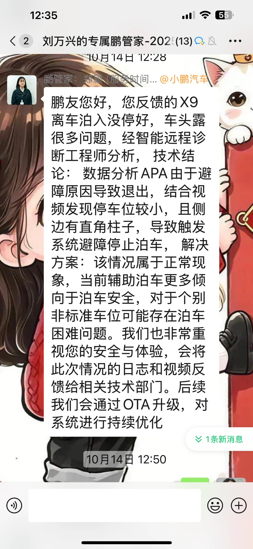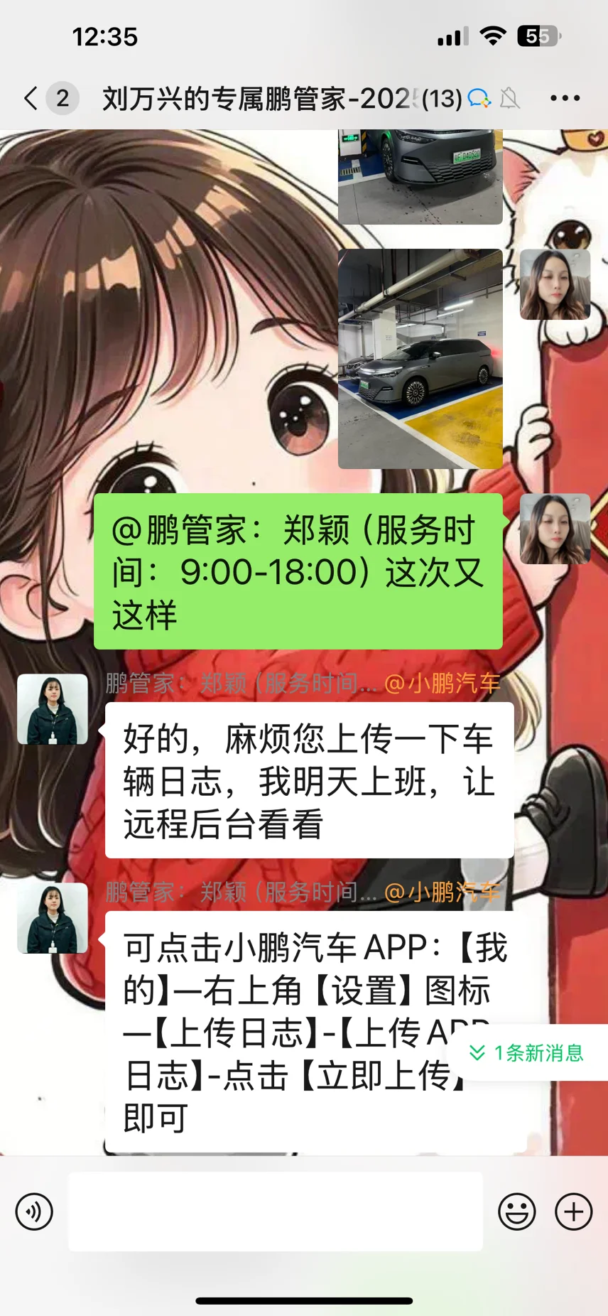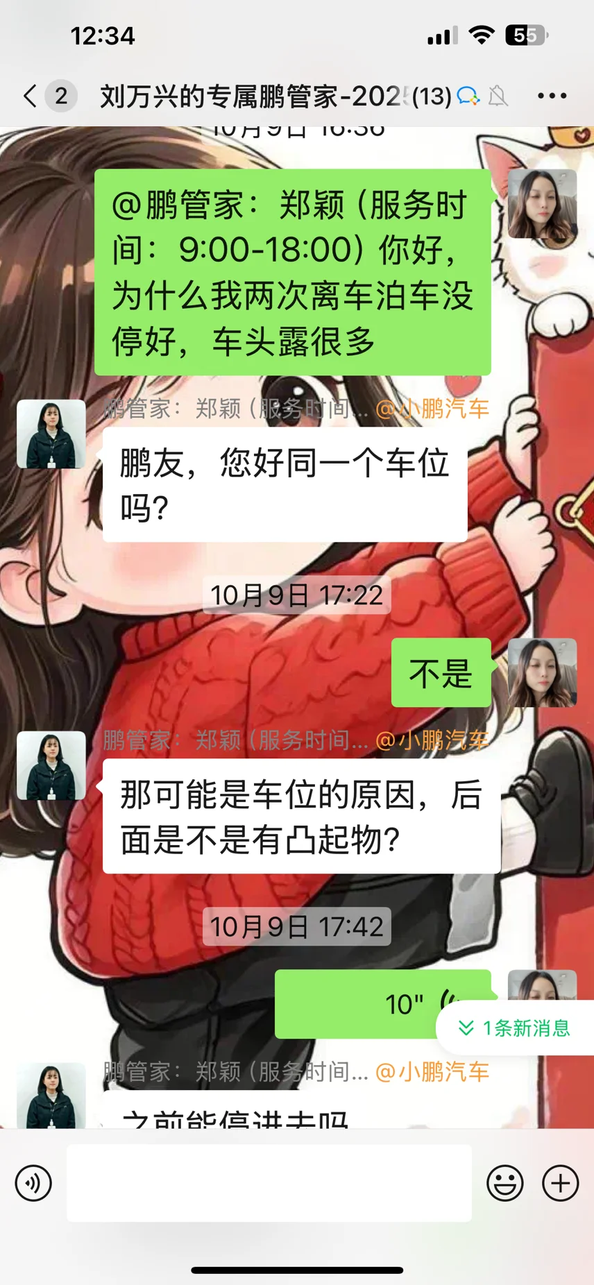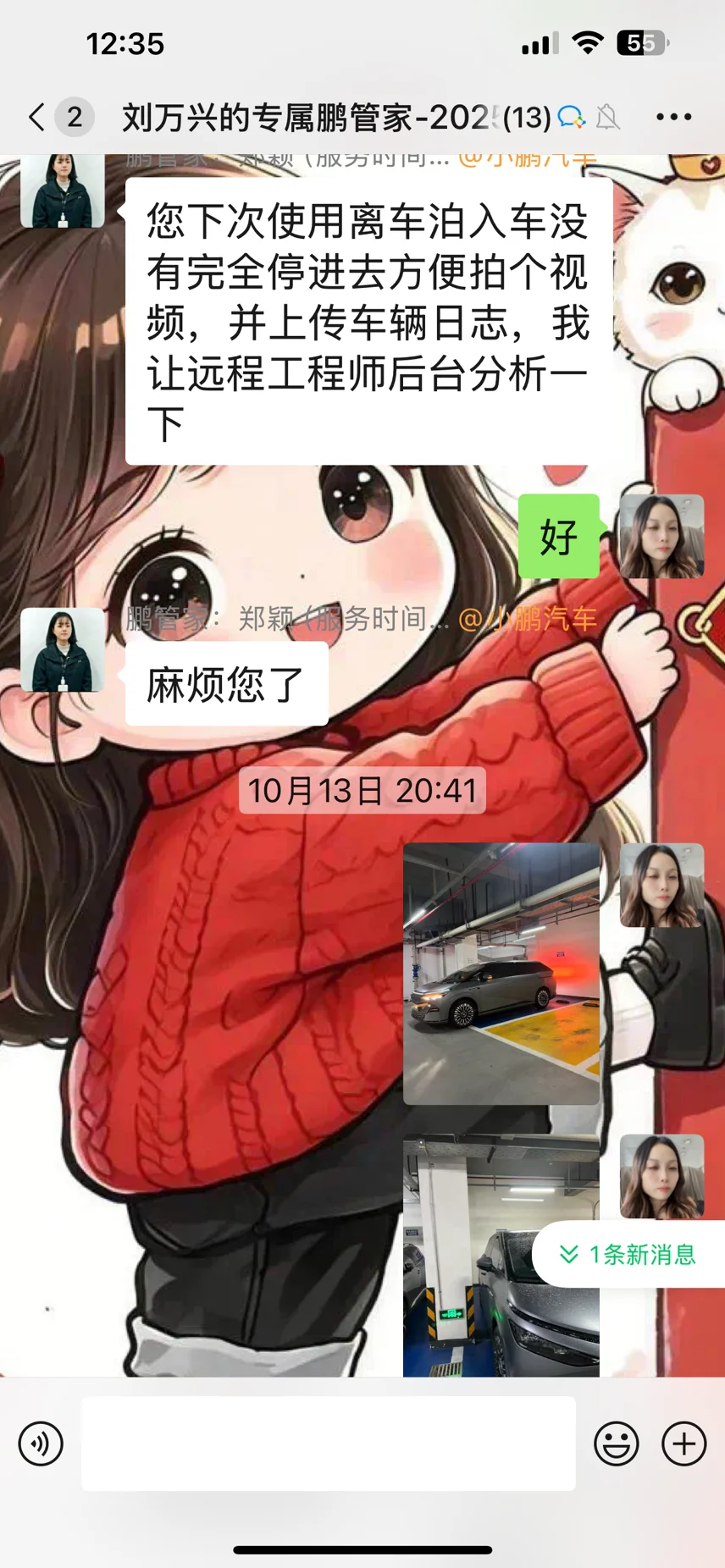 一次离车泊车后,车辆未停入停车框框内。我及时和管家反应情况,小鹏管家非常耐心地教我拍下车辆的照片,教我如何上传日志。