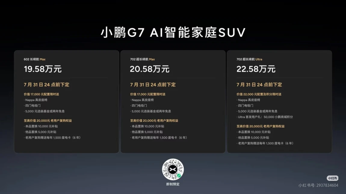 #小鹏汽车 #小鹏汽车首批车主 工作了计划换辆车,比较了阿维塔07,问界m7,极氪7X,和小鹏G7,最终还是选择了G7,主要原因有以下几点:1. 性价比的神,相同价格小鹏g7可以给到前后排座椅通风,加热和按摩,大定还有真皮座椅和电吸门2. AR-HUD挺厉害的,开车全过程中不用因为看屏幕而分散注意力了3. 买新不买旧,小鹏G7是7月才出的,电车市场变化非常大,通常每年都会有不同感受,所以买新发布的可以减缓被淘汰的时间成本。