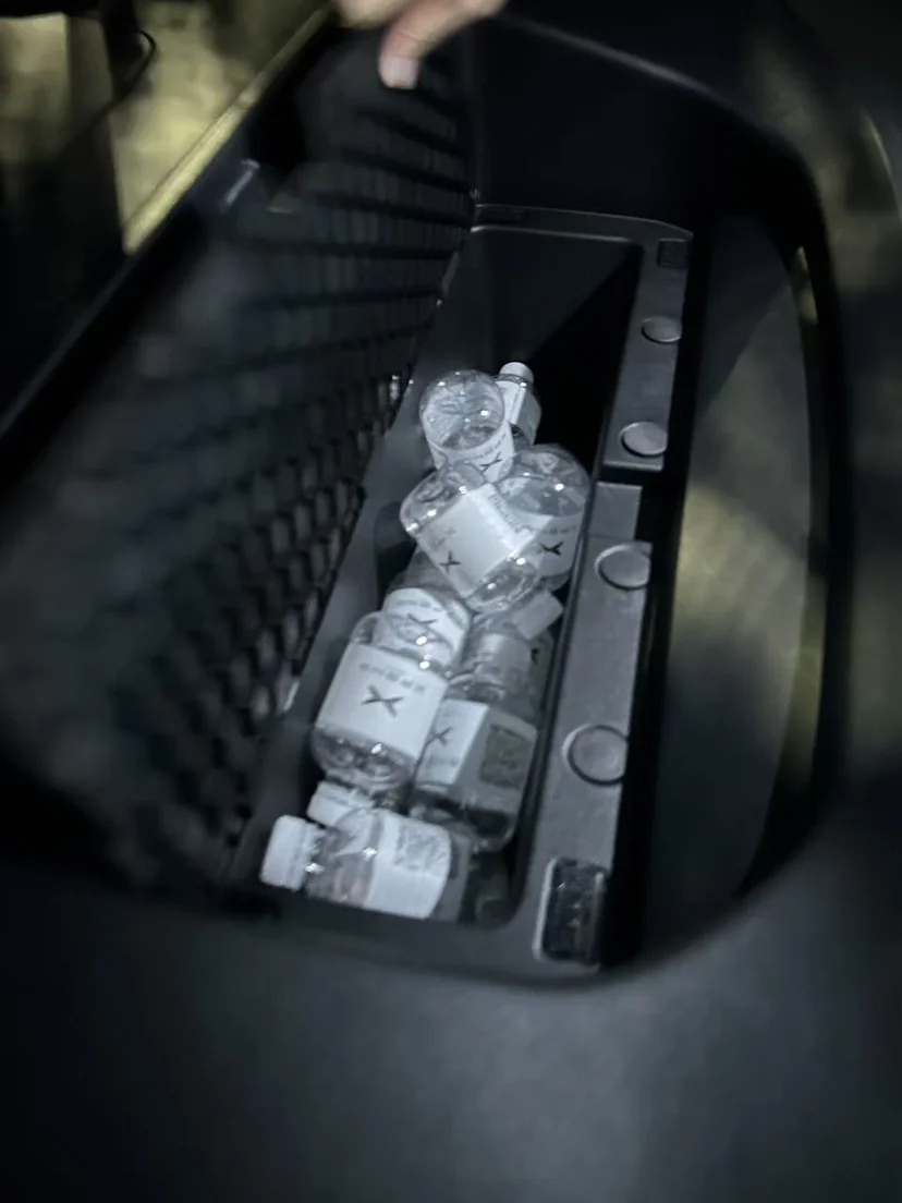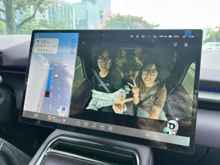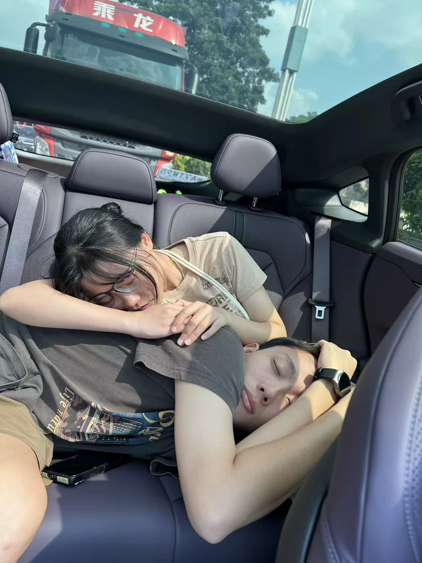 车顶摄像头随时抓拍旅途合照,后排伙伴舒服到秒睡(空调给力!)。前备箱也没闲着,被我塞满“薅”来的小鹏矿泉水,该省省该花花~😂