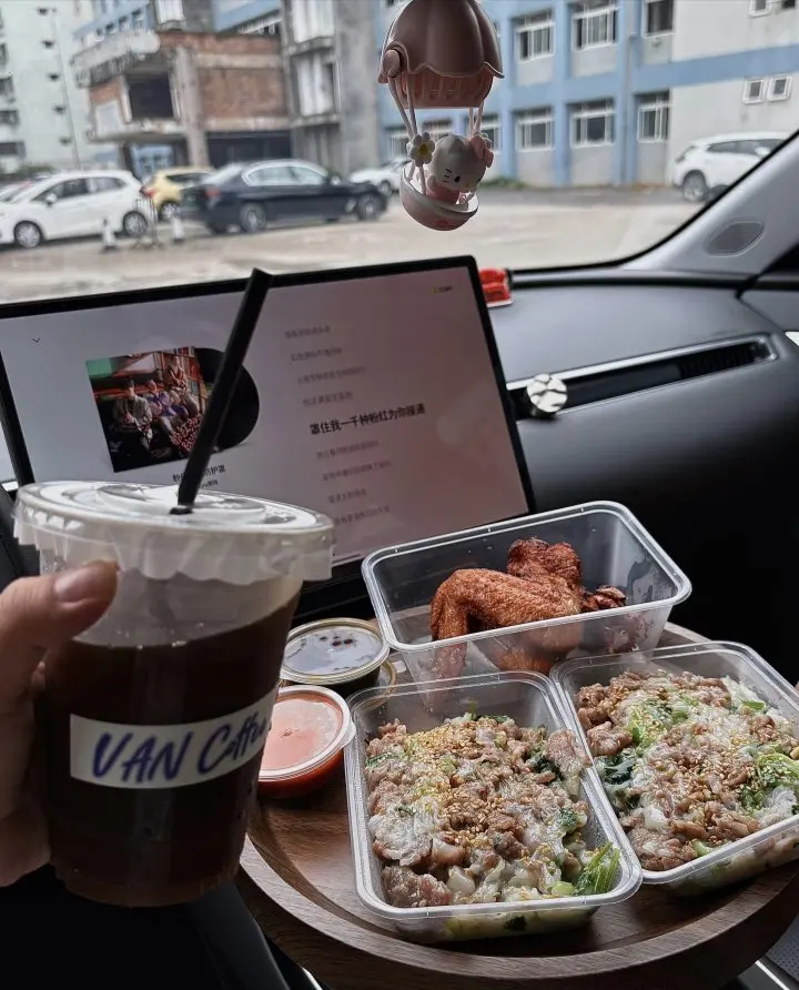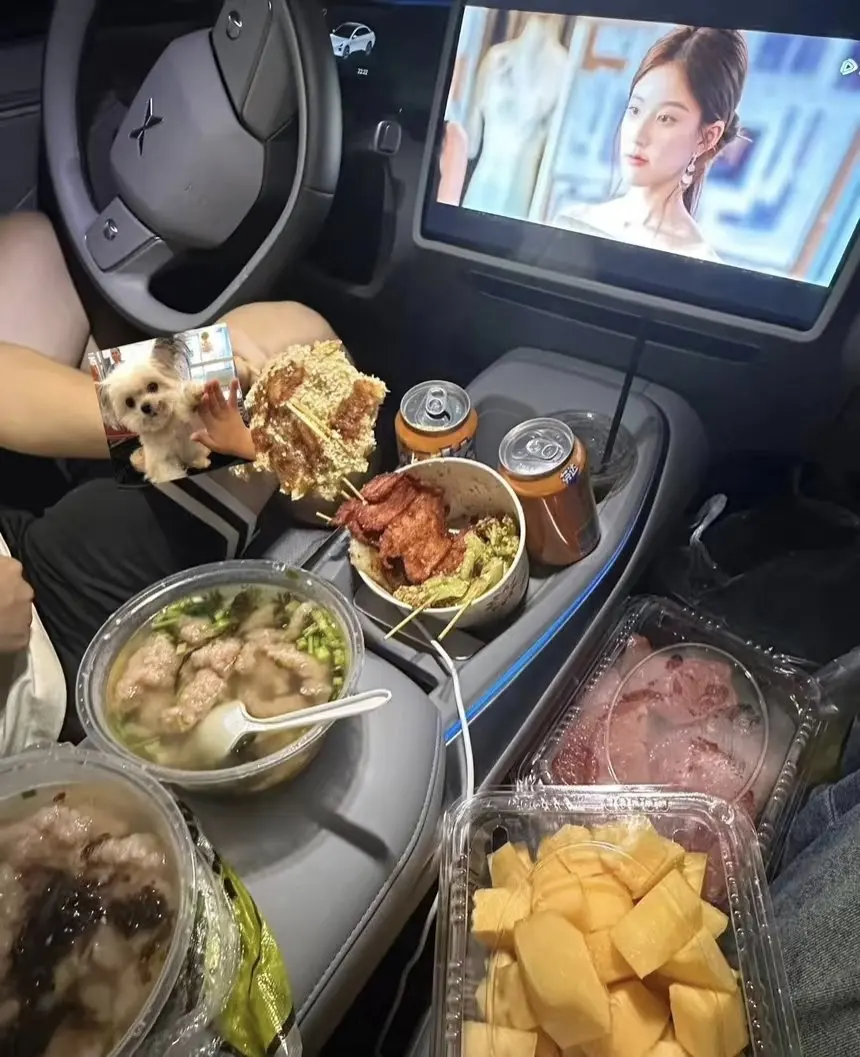 在小鹏mo3里面吃饭喝茶,真的很舒服,外面冷嗖嗖,车里暖烘烘,用车一年啦,还是很爱