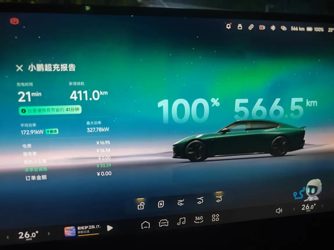 充电效率彻底治愈里程焦虑。虽然我选的最低配版本,日常通勤大概每天60多公里,一周充一次电足够。用上新车送的优惠券充自营电卡,试过小鹏自营超充站,也试过用第三方快充桩,充满100也大概20多分钟,拼好电时段充电成本还能更低。