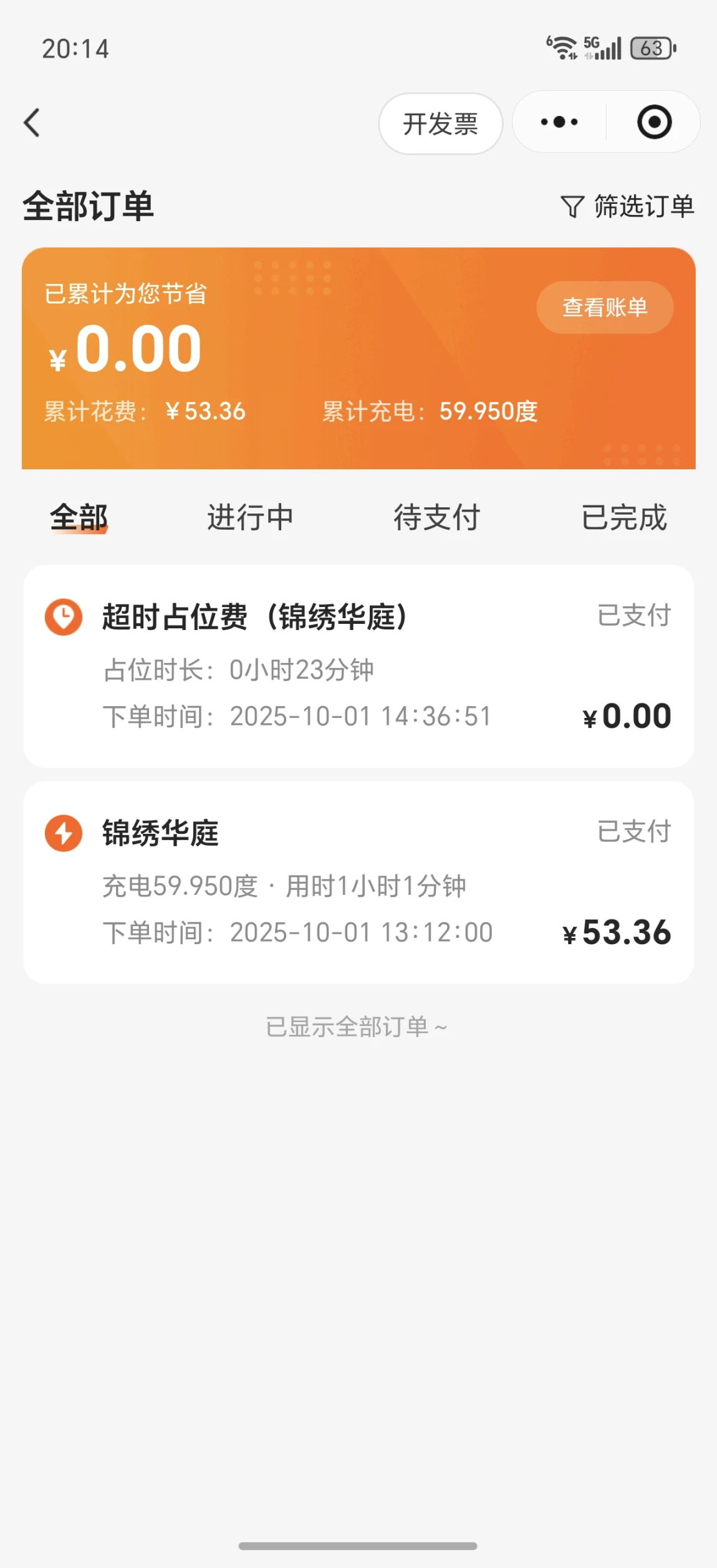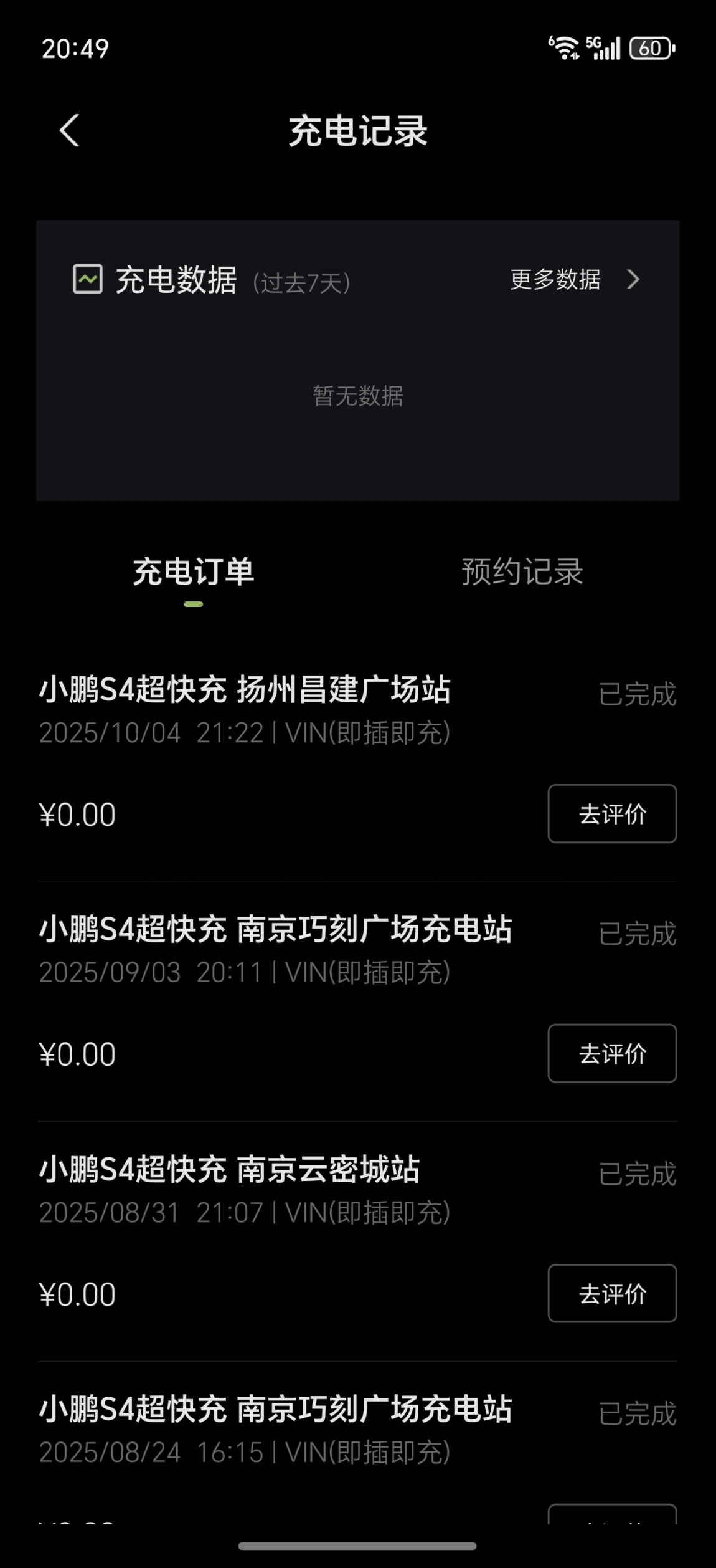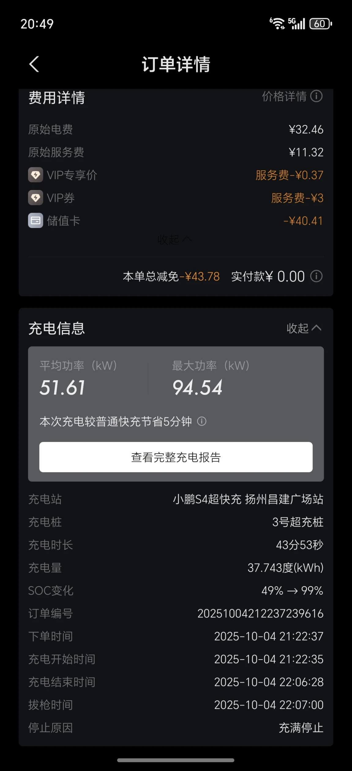 10月4日晚上:43.78元(积分减免)-返程后的最后一次补电,最惊喜的是这次费用完全用小鹏APP的积分抵扣了,实付0元!