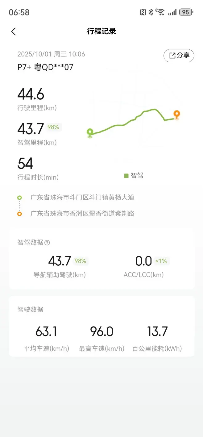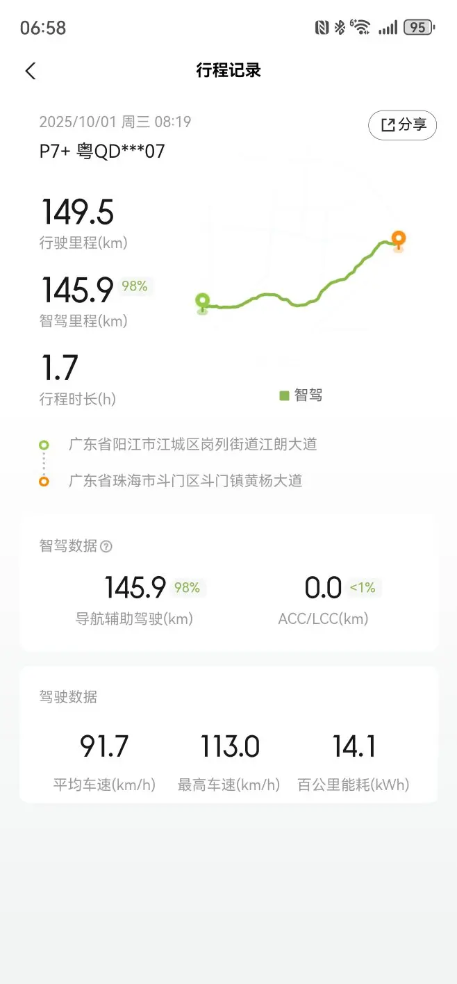 10月1日,我加入了阳江到珠海的出行大军,只为一顿心心念念的水濑自助餐。去程异常顺利,没有堵车的烦恼,小鹏P7+的能耗表现更是让我惊喜,高速能耗大概14kwh,如此优秀的表现让我对它的续航更有信心。