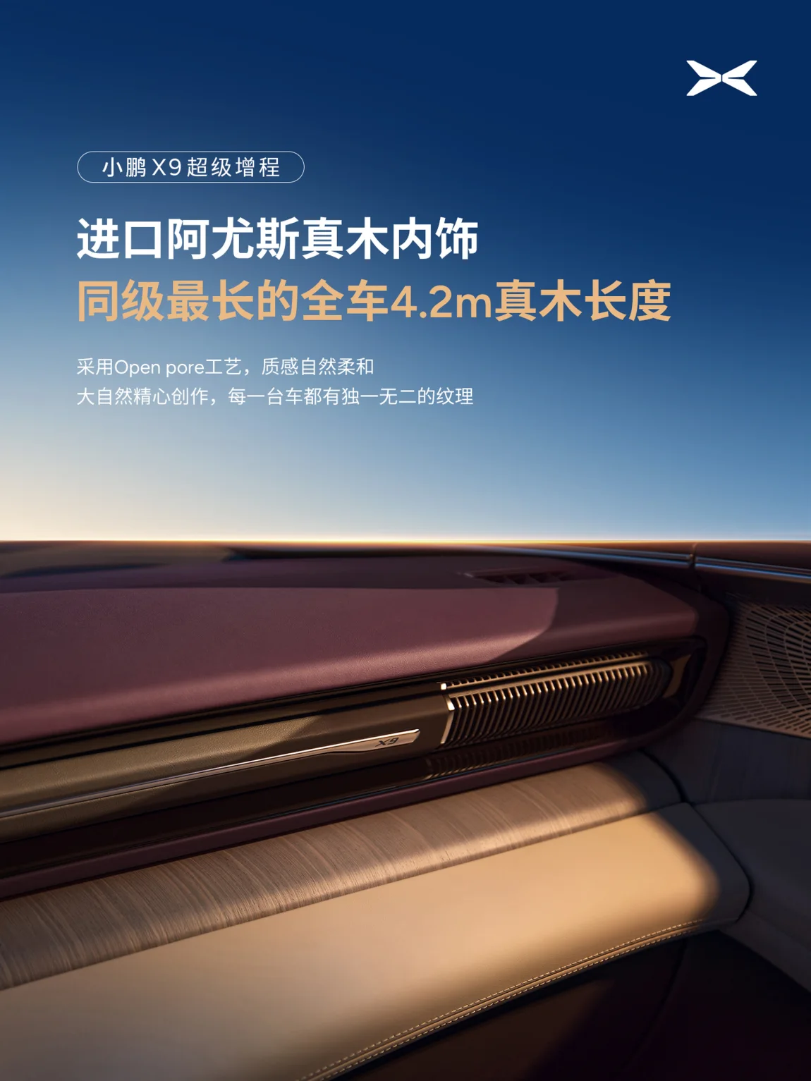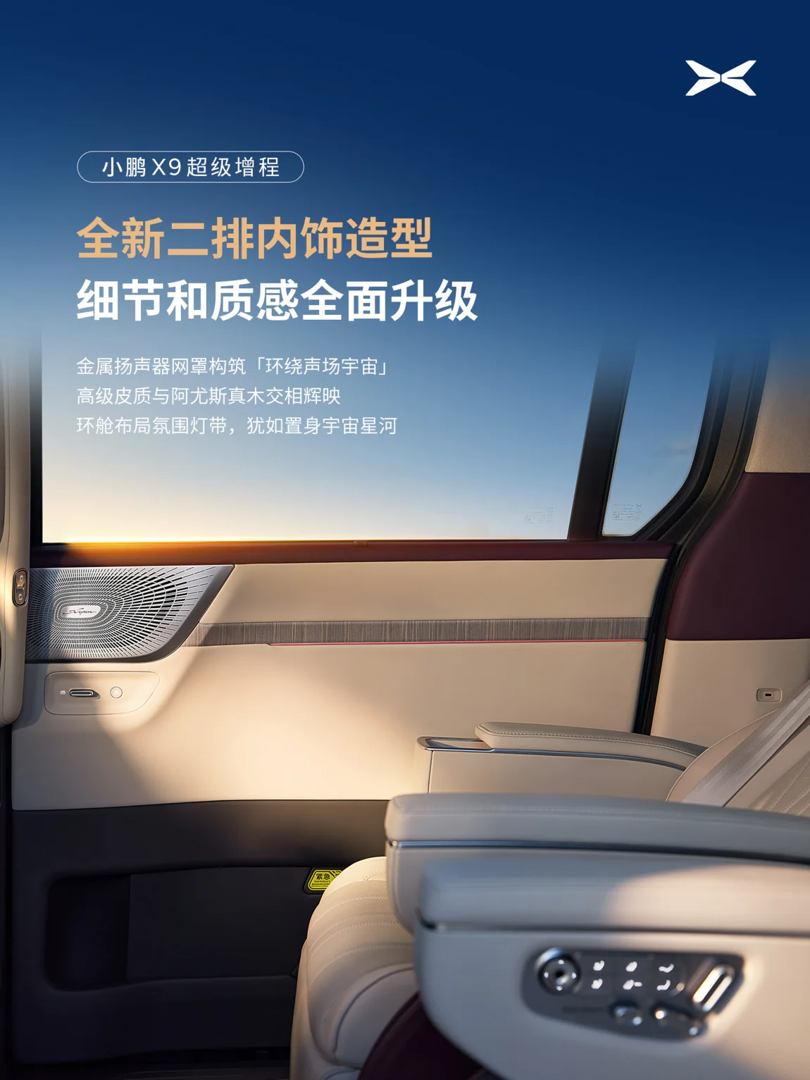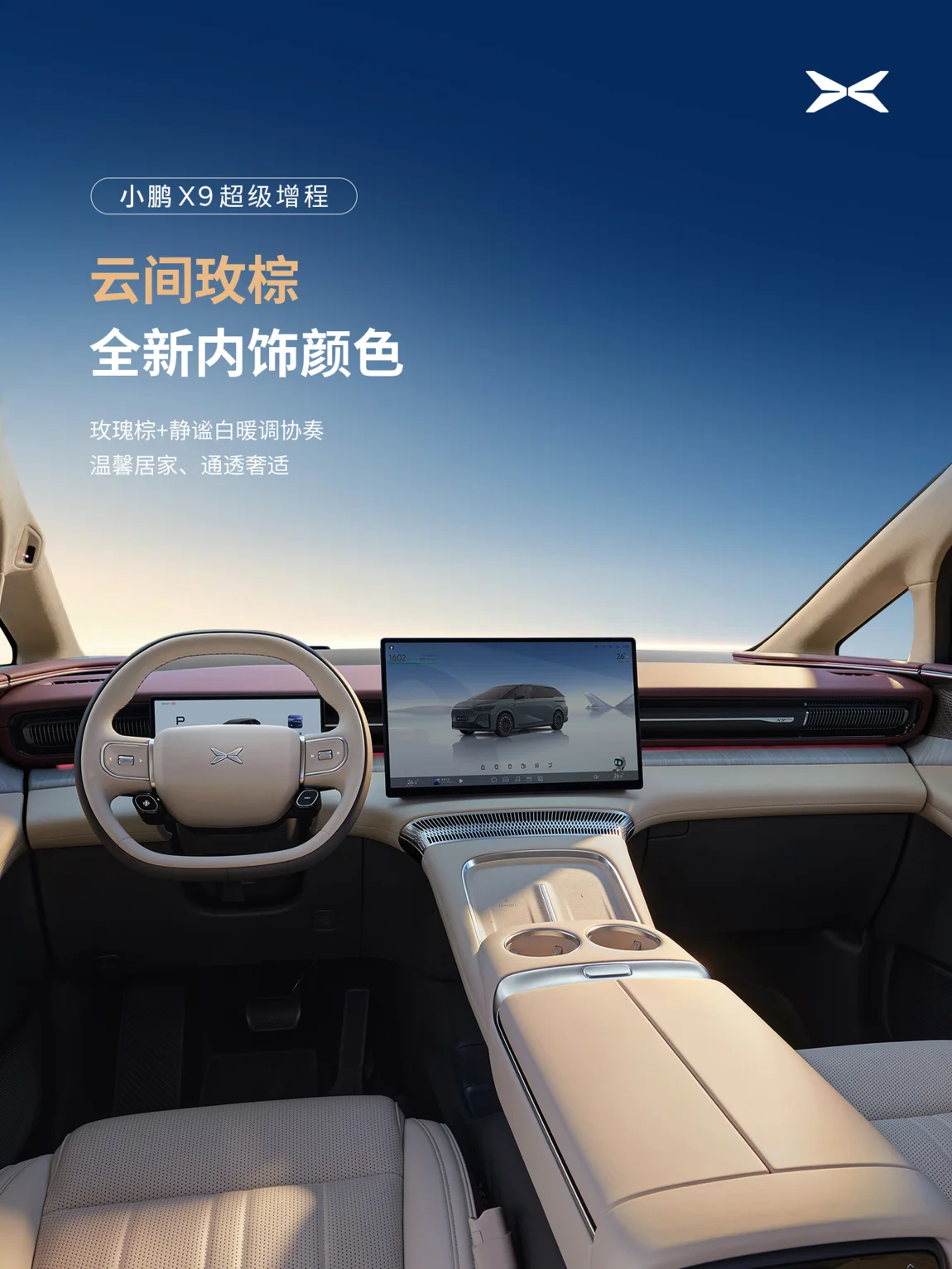 小鹏X9超级增程内饰全面焕新!全新内饰颜色「云间玫棕」,玫瑰棕+静谧白拼色,更适合家庭的高端奢适暖色调 4.2米进口阿尤斯真木内饰,同级最长的全车真木长度星舰领航方向盘搭载左右卫星按键,左手科技右手舒适行业首发AI航空阅读灯,坐躺皆享最佳照明体验水滴涟漪扬声器,视觉与声学完美交响💫全新二排内饰造型 ,细节诠释