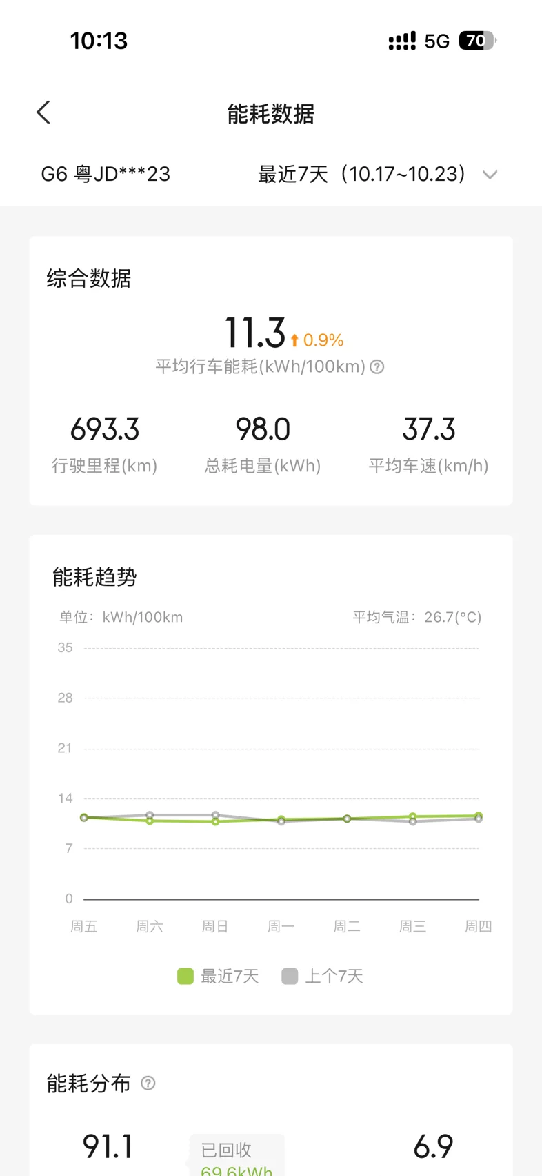 最近7天平均能耗11.3kWh/100km📊,跑了693.3km总耗电量才98.0kWh,这能耗控制也太优秀了!在桂林市区和龙脊山路切换,平均车速37.3km/h,不管是爬坡还是市区通勤,G6都很给力,续航焦虑?不存在的~