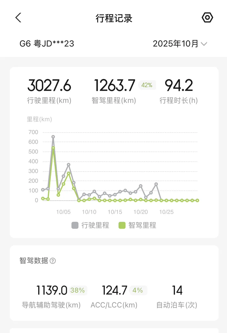 从都市驶入龙脊梯田的山路,层叠的稻浪在山间起伏,小鹏G6的导航辅助驾驶一路稳稳当当,10月累计智驾里程1263.7km,其中导航辅助驾驶占了1139.0km🌍。在桂林市区穿梭时,自动泊车14次,面对复杂车位都能一把进,逛景点再也不用为找车位焦虑啦😌