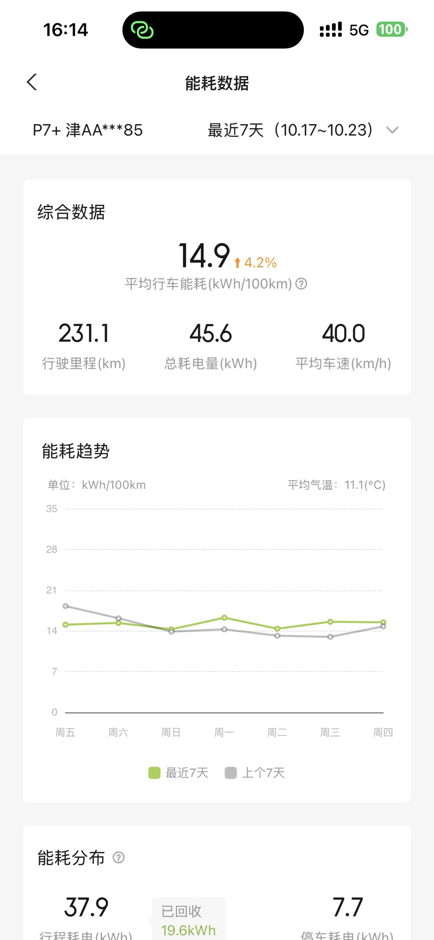 10月17日-10月23日,共行驶231km,单日能耗从最低11.9-15.1不等,总耗电量45.6度电,平均能耗为14.9kwh/100km,车机显示最近100km平均能耗为14.3kwh/100km;