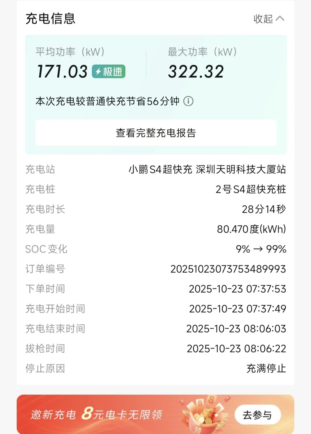 小鹏 S4 超充桩从 9% 充到 100% 才不到30 分钟,峰值功率直接飙到 322kW,喝杯咖啡的功夫就满电复活。