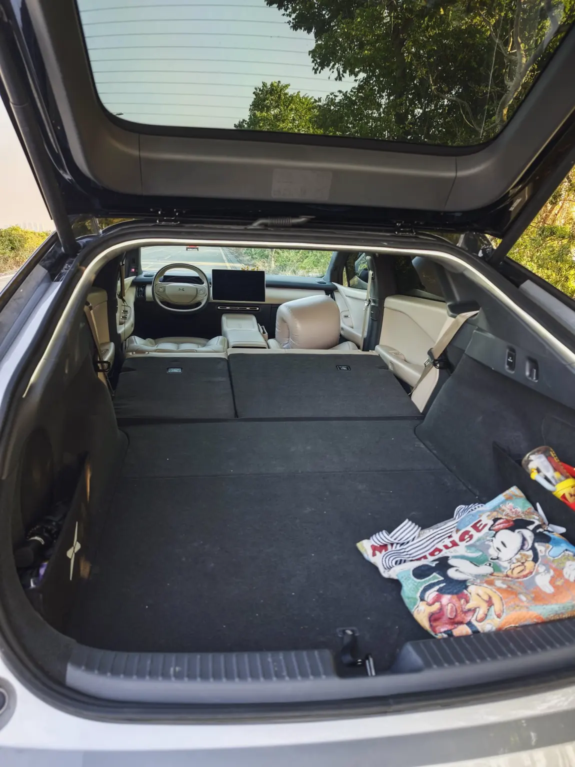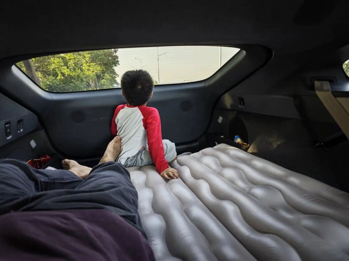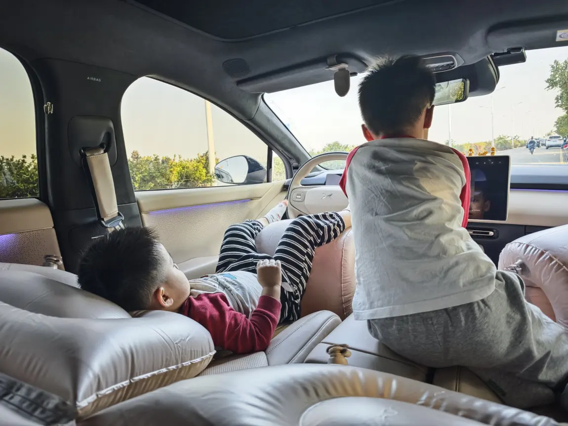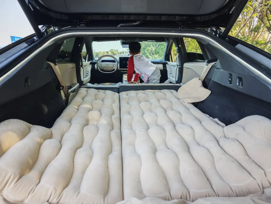 终于把后备箱的床垫拿出来用了一下,吃灰太久了,哈哈。小P非常省心,车内打开睡眠空间,加上前排就太长了,需要另外的垫子才行,有一说一,P7+的空间还是比较满意的。