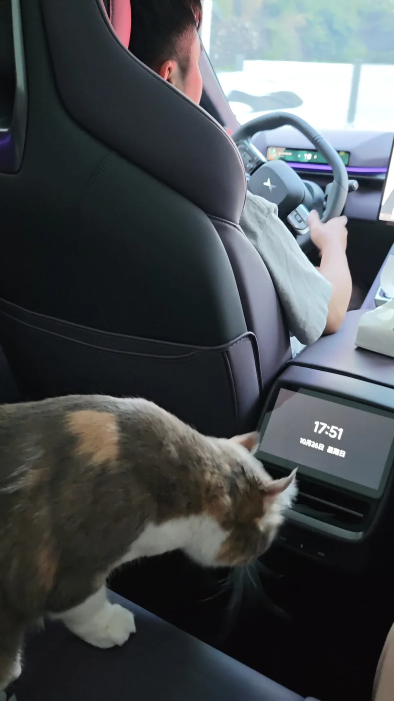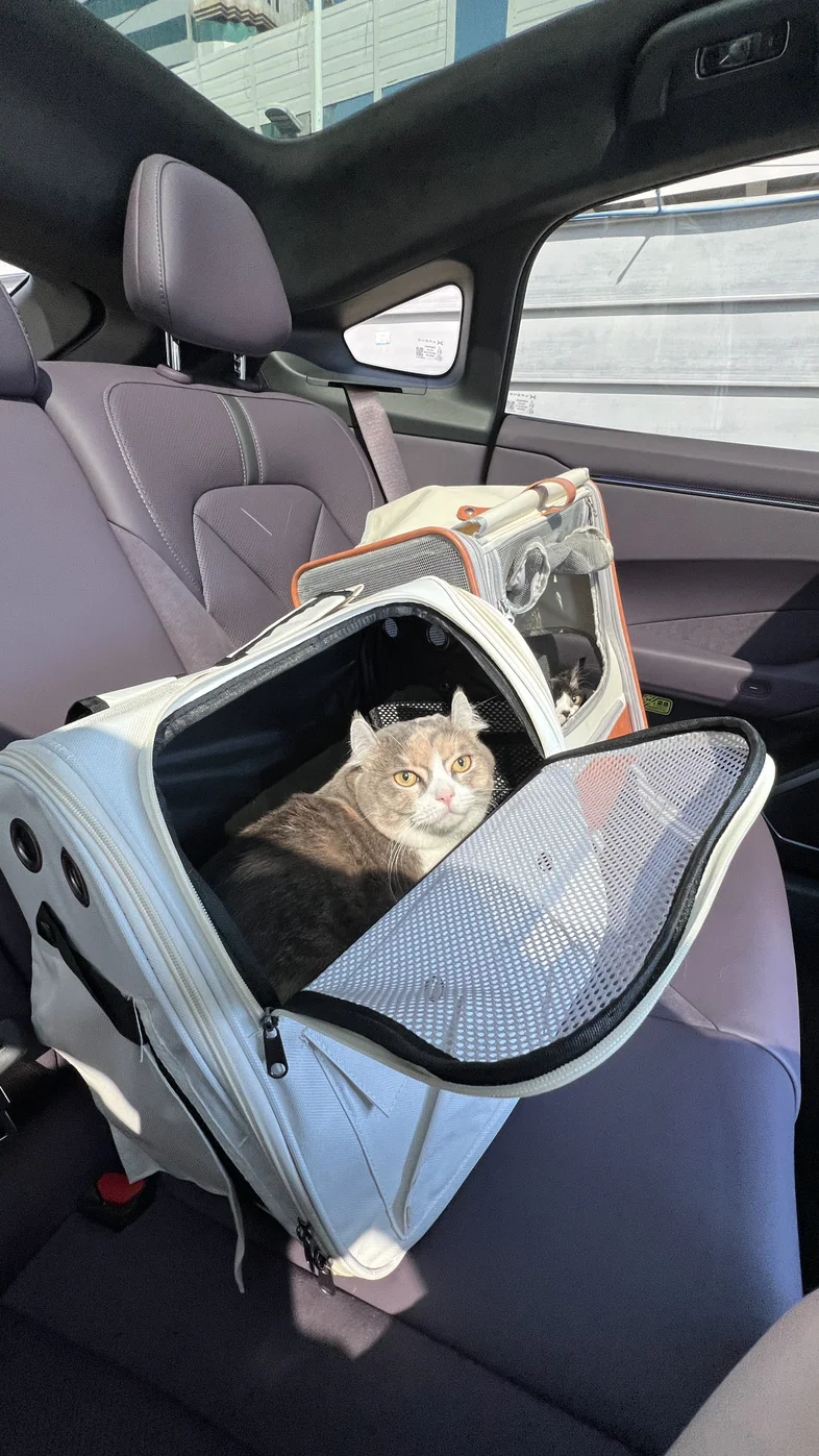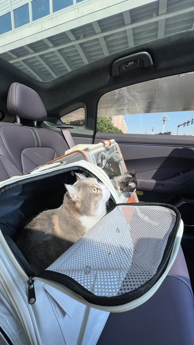 我家两只都是“上车怂”,但P7的平稳和安静真是救命了!起步、刹车都很柔,加上关窗后优秀的隔音,路上嘈杂的喇叭声被过滤掉大半,两只小家伙明显没以前那么焦躁了。我把空调调到舒适温度,它们就在猫包里安心趴着了~