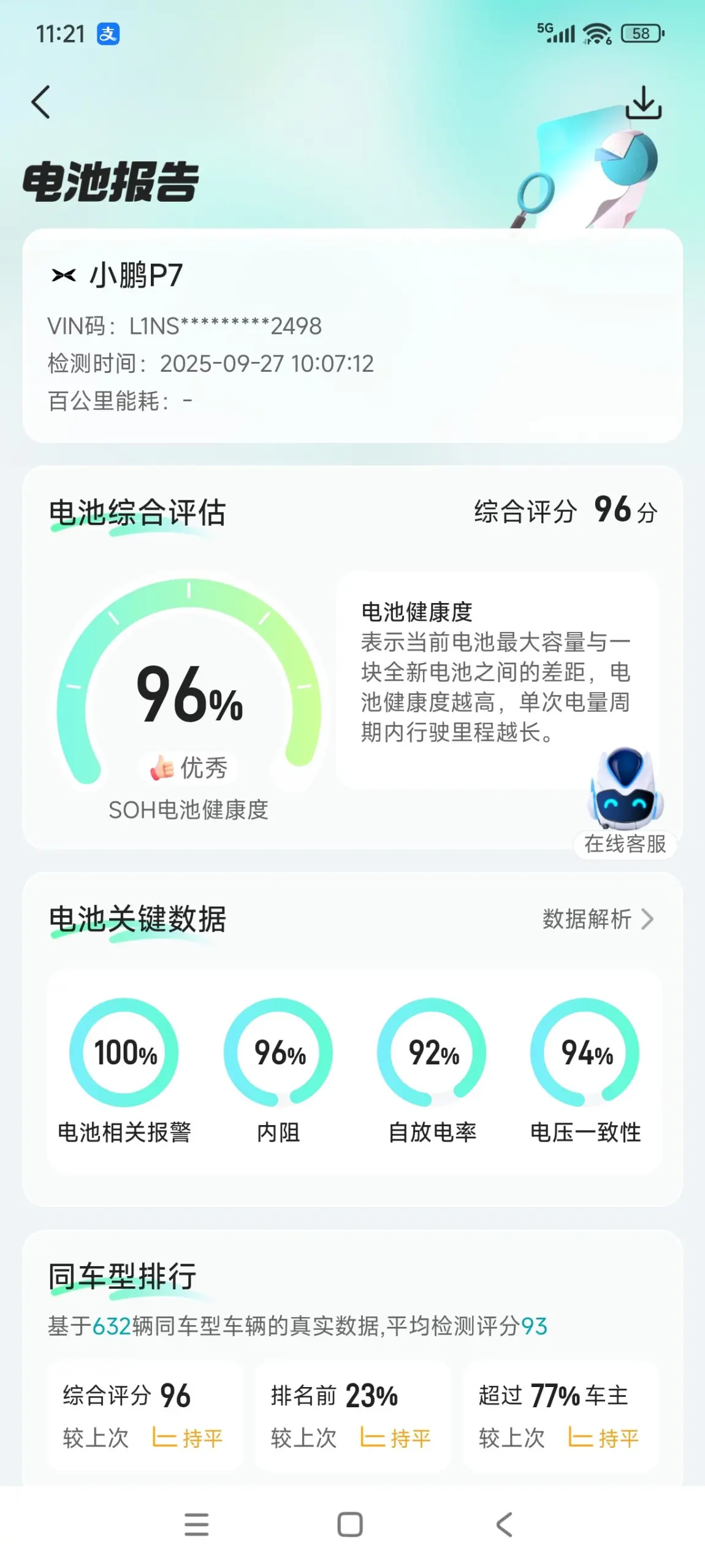 今天特来电慢充,给了一个检测报告,还剩77度电容量。小鹏自己有这种检测吗?